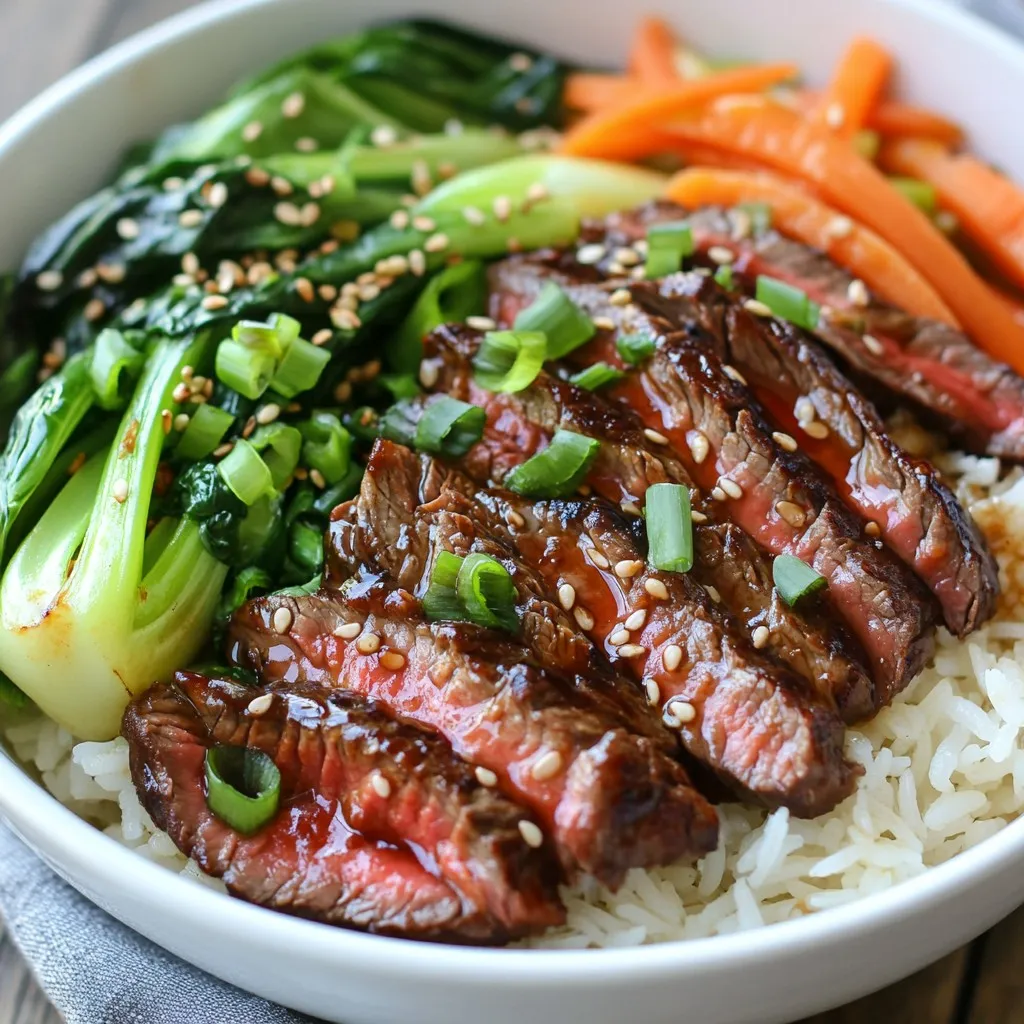To make your meal look amazing, arrange the rice in a mound. Fan the steak slices on top. Place the colorful vegetables next to the steak. This makes the dish pop. For garnish, sprinkle sesame seeds and add green onions. You can also add a side of kimchi for a vibrant touch.