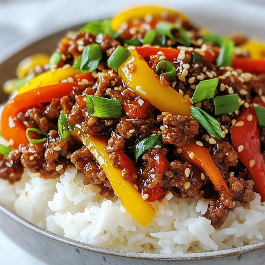 A colorful dish looks great! Serve the beef and veggies in a swirl over the rice. Use a mix of bell peppers for a bright look. Add a small bowl of kimchi on the side. This adds flavor and color. For garnishing, sprinkle sesame seeds on top. Toss some extra chopped green onions for a fresh touch.