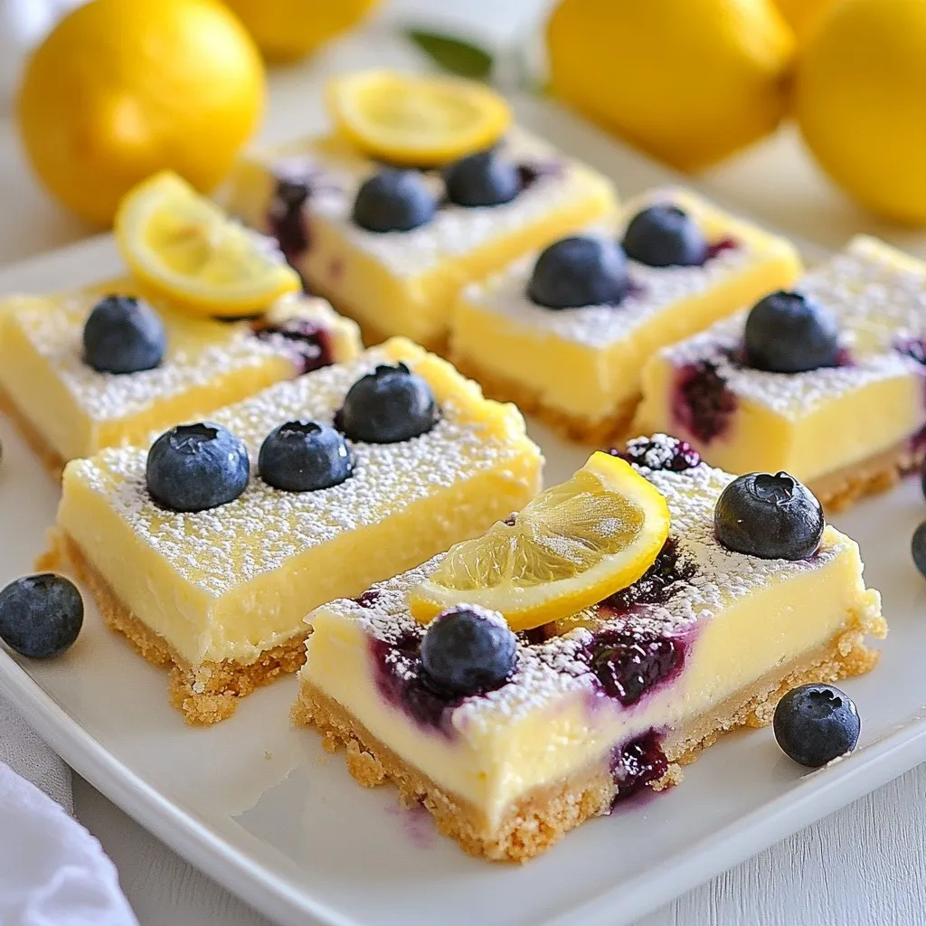 Delicious cheesecake bars with a lemon and blueberry flavor, perfect for a refreshing dessert.