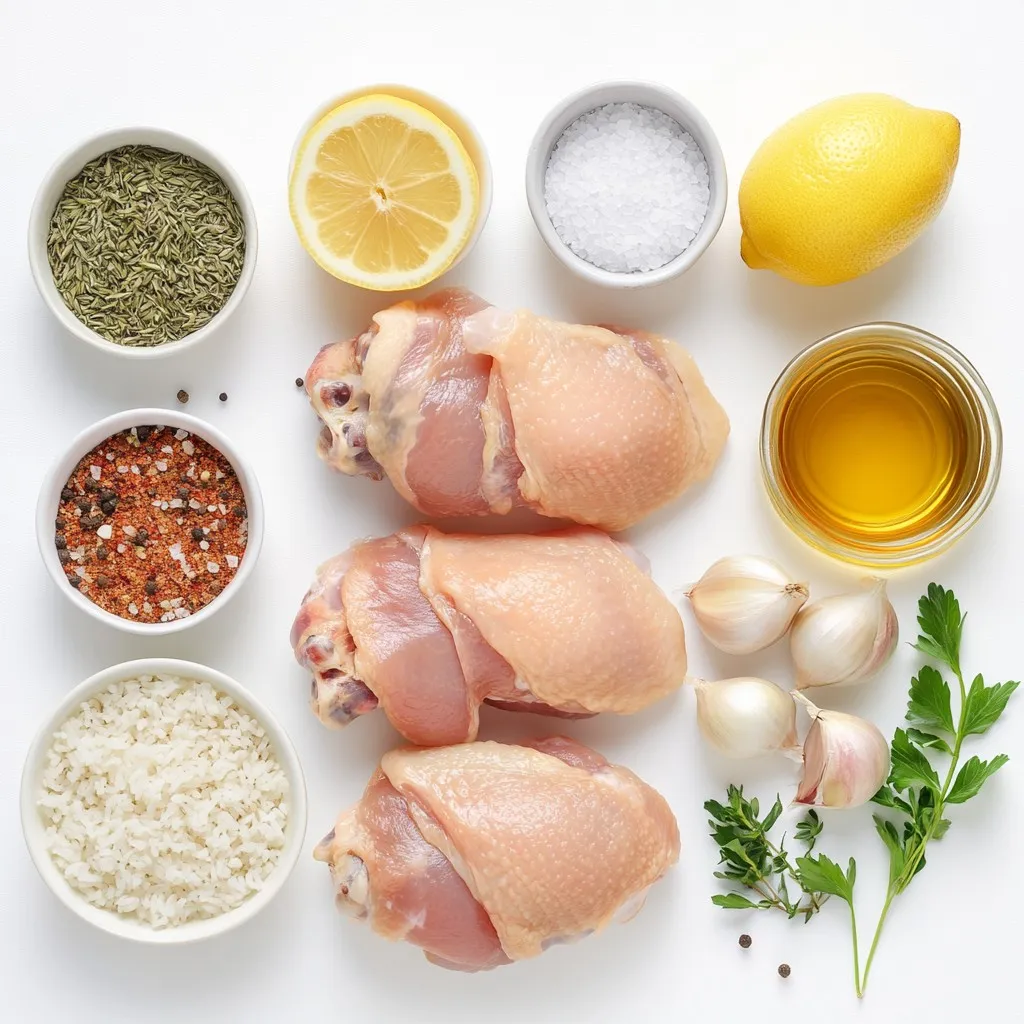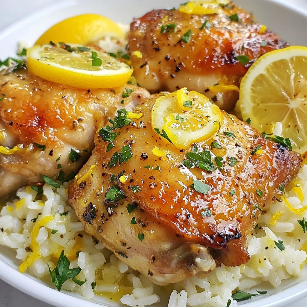 A flavorful dish featuring marinated chicken thighs served over fluffy rice with a zesty lemon and herb infusion.