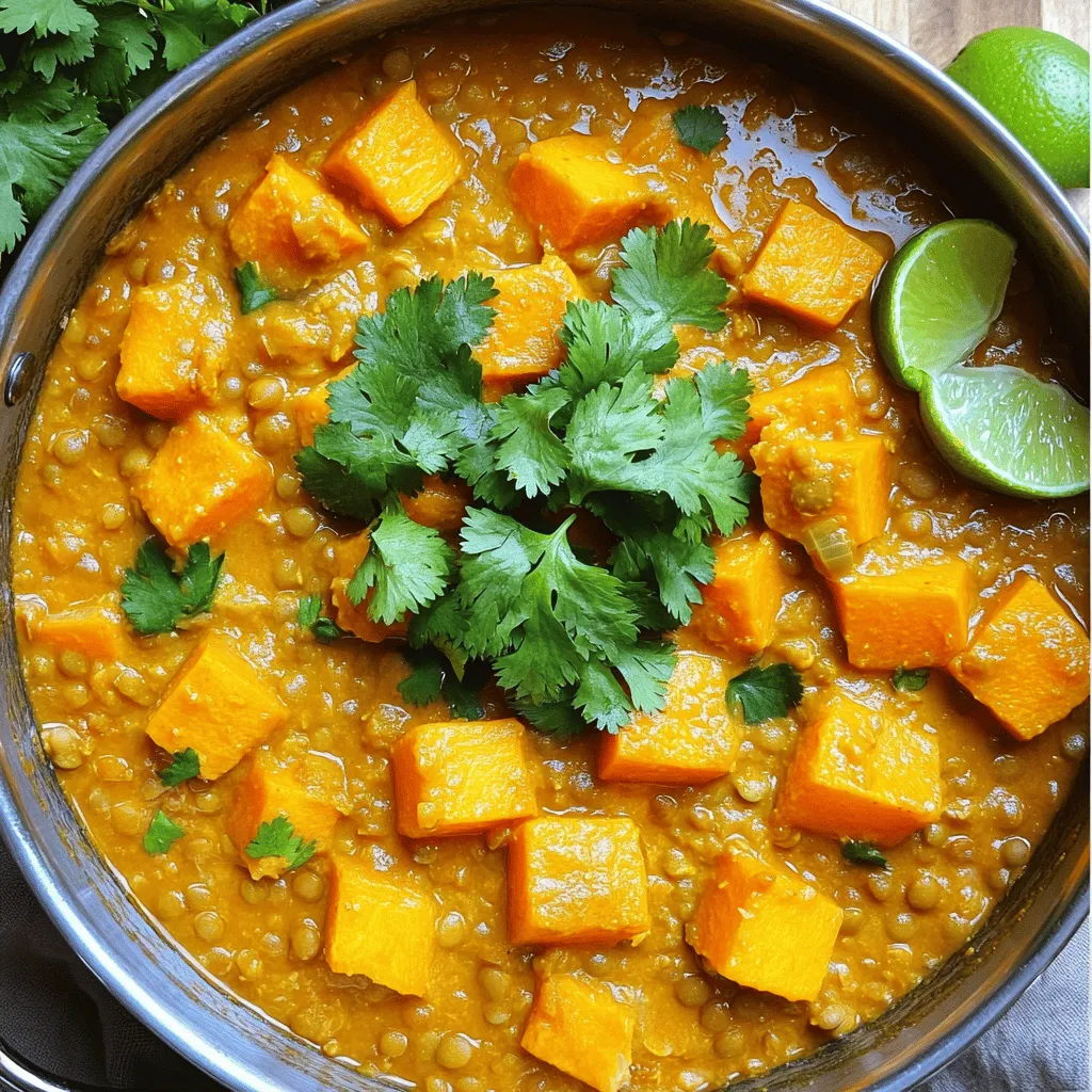 - 1 cup red lentils, thoroughly rinsed - 2 cups pumpkin, peeled and cut into bite-sized cubes - 1 can (400 ml) coconut milk - 1 medium onion, finely chopped - 3 cloves garlic, minced - 1-inch piece of fresh ginger, grated - 1 tablespoon curry powder - 1 teaspoon turmeric powder - 1 teaspoon ground cumin - 1 can (400 g) diced tomatoes, including juice - 2 cups vegetable broth - 2 tablespoons olive oil - Salt and pepper, to taste - Fresh cilantro, chopped, for garnish - Optional: Lime wedges, for serving This recipe starts with three key ingredients: red lentils, pumpkin, and coconut milk. The red lentils give the dish a nice texture and protein boost. The pumpkin adds a sweet flavor and a creamy feel. Coconut milk makes it rich and smooth. Next, we need aromatics and spices. Onions, garlic, and ginger are must-haves. They bring a strong base flavor. Curry powder, turmeric, and cumin add warmth and depth to the dish. Finally, we have additional components. Diced tomatoes add acidity and freshness. Vegetable broth makes the curry juicy and flavorful. Olive oil helps to sauté the aromatics and blend all the flavors. Don't forget to season with salt and pepper. Fresh cilantro adds a bright touch on top, while lime wedges give a zesty kick. This dish is comforting and full of flavor! First, I heat olive oil in a large pot over medium heat. This oil adds flavor and helps cook the onions. I chop one medium onion finely. I add this to the pot and sauté it for about five minutes. The onion should become soft and clear. Next, I add three minced garlic cloves and one inch of grated fresh ginger. I cook this mixture for another minute. It should smell wonderful! Now, it's time to spice things up. I sprinkle in one tablespoon of curry powder, one teaspoon of turmeric, and one teaspoon of ground cumin. I stir it well and cook for around 30 seconds. This toasting step brings out the spices' rich flavors, filling your kitchen with a warm aroma. Next, I add two cups of pumpkin, cut into bite-sized cubes, and one cup of rinsed red lentils to the pot. I also pour in one can of diced tomatoes, with all their juices, and two cups of vegetable broth. I mix everything together well, ensuring the ingredients are well combined. I increase the heat to high and bring the mixture to a gentle boil. Once it starts boiling, I reduce the heat to low. I cover the pot with a lid and let it simmer for 20 to 25 minutes. I check the curry occasionally. The lentils and pumpkin should be tender. If it gets too thick, I add more broth or water. After the lentils and pumpkin are cooked, I pour in one can of coconut milk. I stir this in well and let the curry simmer for another 10 minutes. The coconut milk adds a creamy texture. I season the dish with salt and freshly ground pepper to taste. Finally, I remove the pot from heat. I serve the curry hot, garnished with fresh cilantro. I like to add lime wedges on the side. The lime adds a bright flavor that pairs perfectly with the curry. Enjoy your delicious Lentil & Pumpkin Coconut Curry! To get the right texture, adjust the consistency with broth or water. If your curry is too thick, add some vegetable broth or water until it feels just right. When cooking lentils and pumpkin, keep an eye on the time. Cook them for about 20 to 25 minutes. This lets both ingredients become tender without falling apart. You can boost the flavor with extra spices or herbs. Try adding a pinch of cinnamon or a splash of soy sauce for depth. Fresh herbs like basil or mint can also add brightness. When you serve the curry, pair it with fluffy rice or warm naan. This helps soak up the delicious sauce. If you want to prepare this dish in advance, it's easy. Cook the curry and let it cool before storing. You can keep it in the fridge for about three days. When ready to enjoy, just reheat it on the stove. Add a little water if it looks too thick. This way, you can savor the flavors any day of the week! {{image_4}} You can change the lentils or squash used in this dish. Try green or brown lentils for a different taste and texture. If you prefer, swap pumpkin for sweet potato or butternut squash. These alternatives will offer a unique twist. You can also add proteins like chickpeas for a plant-based option. For meat lovers, shredded chicken works well too. Just add it when you mix the main ingredients. Want a mild curry? Use less curry powder and skip spicy peppers. For those who love heat, add chopped fresh chili or cayenne pepper. Start slow and taste as you go. You can always add more spice, but you can’t take it out! This curry is easy to adapt for various diets. It is naturally vegan, thanks to the coconut milk. If you need gluten-free options, check your broth and spices. Most are safe. For a low-carb version, reduce the pumpkin. You can replace it with extra lentils or add more vegetables like spinach or kale. This way, you still enjoy a hearty meal without the carbs. Store any leftovers in a sealed container. Keep the curry in the fridge. It will stay fresh for up to five days. When you are ready to eat, just give it a stir. Check for any signs of spoilage before eating. To freeze the curry, let it cool completely first. Pour it into an airtight container or freezer bag. Make sure to leave some space for expansion. You can freeze it for up to three months. Label the container with the date for easy tracking. For the best taste, reheat the curry on the stove. Use a medium heat and stir often. If it seems too thick, add a splash of vegetable broth or water. You can also reheat it in the microwave. Use a microwave-safe dish and cover it. Heat in short bursts, stirring in between. This keeps the curry warm and tasty. You can use green or brown lentils in this curry. Red lentils cook faster and become soft. Green and brown lentils hold their shape better. This affects the curry's texture. Try them if you want more bite. To thicken your curry, you can add more lentils. Simmer longer to let it reduce. You