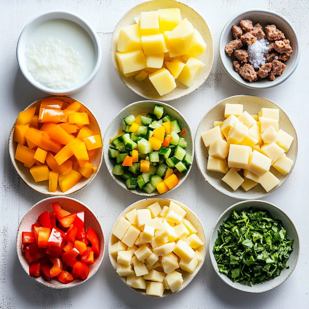 Gathering the right ingredients is key for a great Loaded Breakfast Casserole. Start with the main ingredients. You need six large eggs. These create a fluffy base. Two cups of whole milk add creaminess. One cup of diced cooked potatoes gives it substance. I love using breakfast sausage for flavor. Crumble it into bite-sized pieces for even cooking.