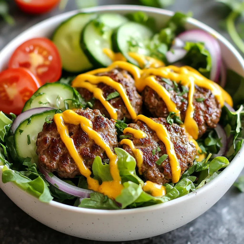 These ingredients come together to create a beautiful dish. The ground beef gives great flavor, while the fresh vegetables add crunch. The mixed greens act as a perfect base, making each bite refreshing. Don’t forget the toppings! Cheddar cheese and dill pickles add extra zest. And the burger sauce ties everything together, making it a tasty meal.