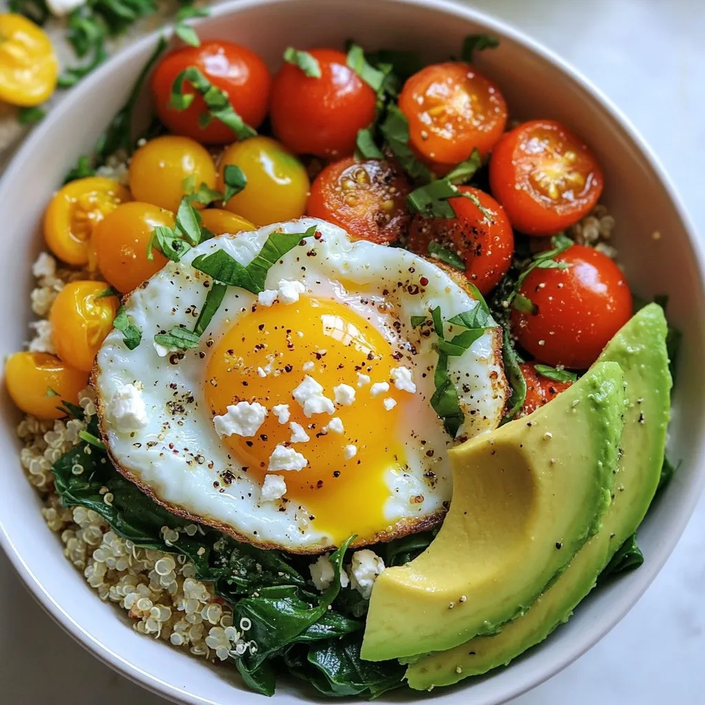 Nutritious and colorful breakfast bowls featuring quinoa, sautéed vegetables, poached eggs, and avocado.
