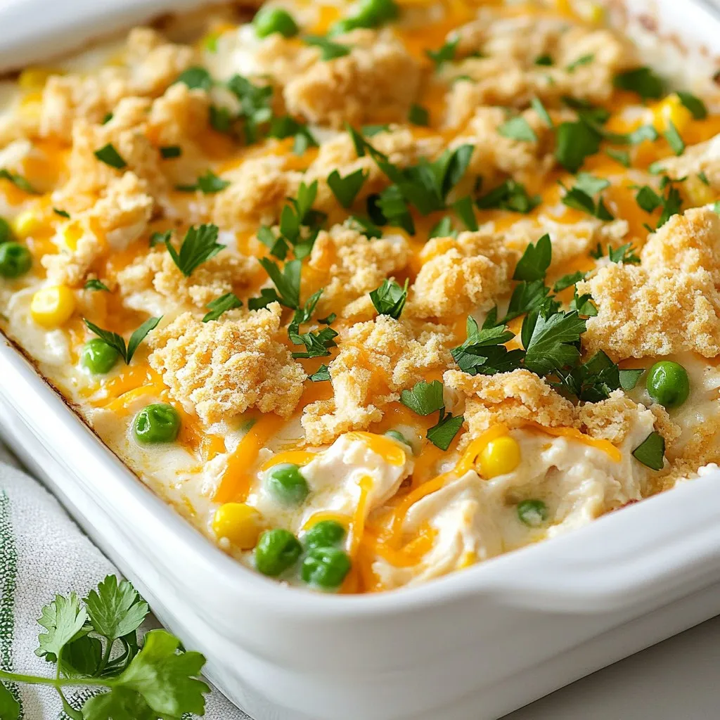 A creamy and cheesy chicken casserole topped with a crunchy cracker layer, perfect for family dinners.