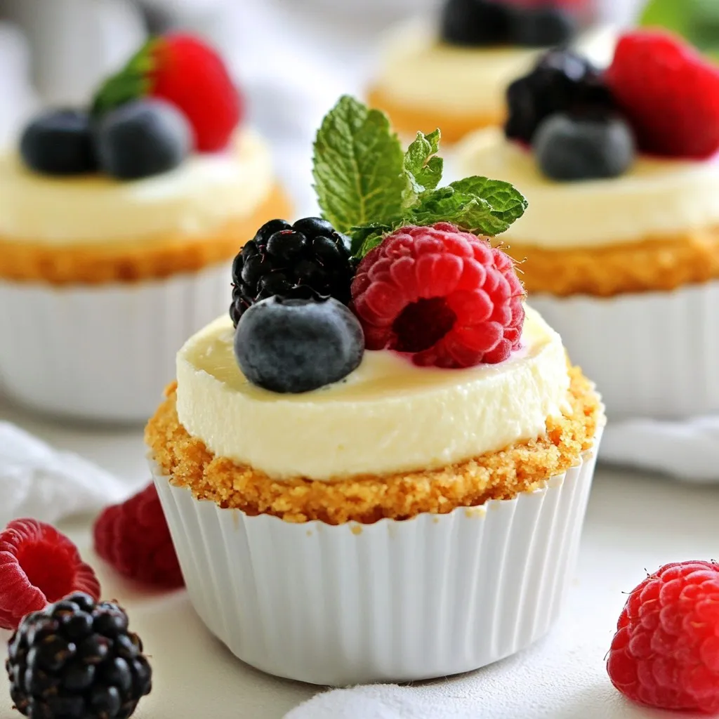 • Just before serving, add a generous topping of fresh berries on each mini cheesecake for a vibrant and delicious finishing touch.