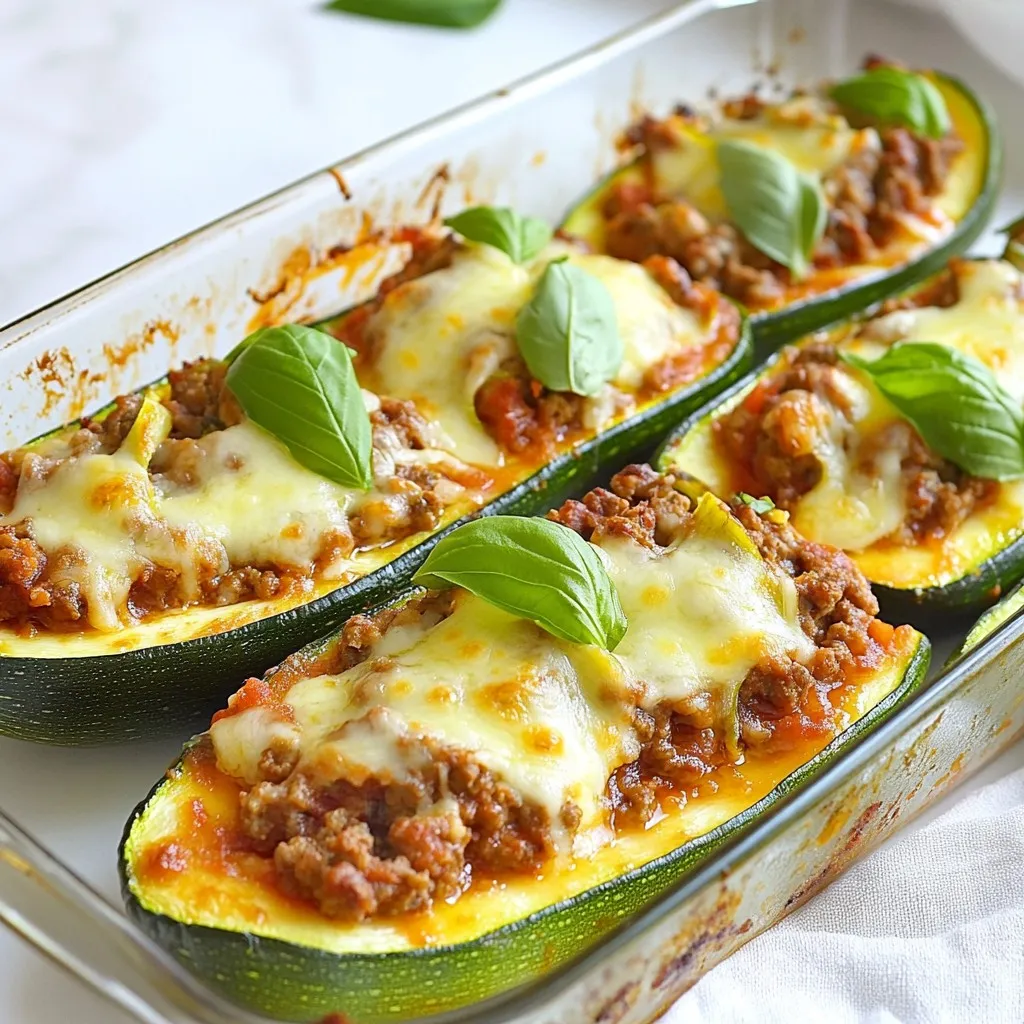 A delicious and hearty dish featuring zucchini halves stuffed with a savory ground beef mixture and topped with melted mozzarella cheese.
