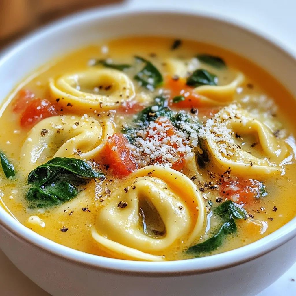 A rich and creamy tortellini soup with fresh spinach and tomatoes, perfect for a comforting meal.