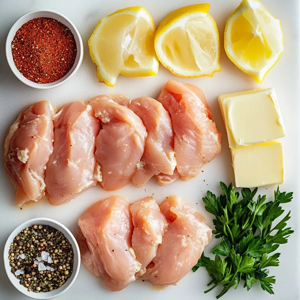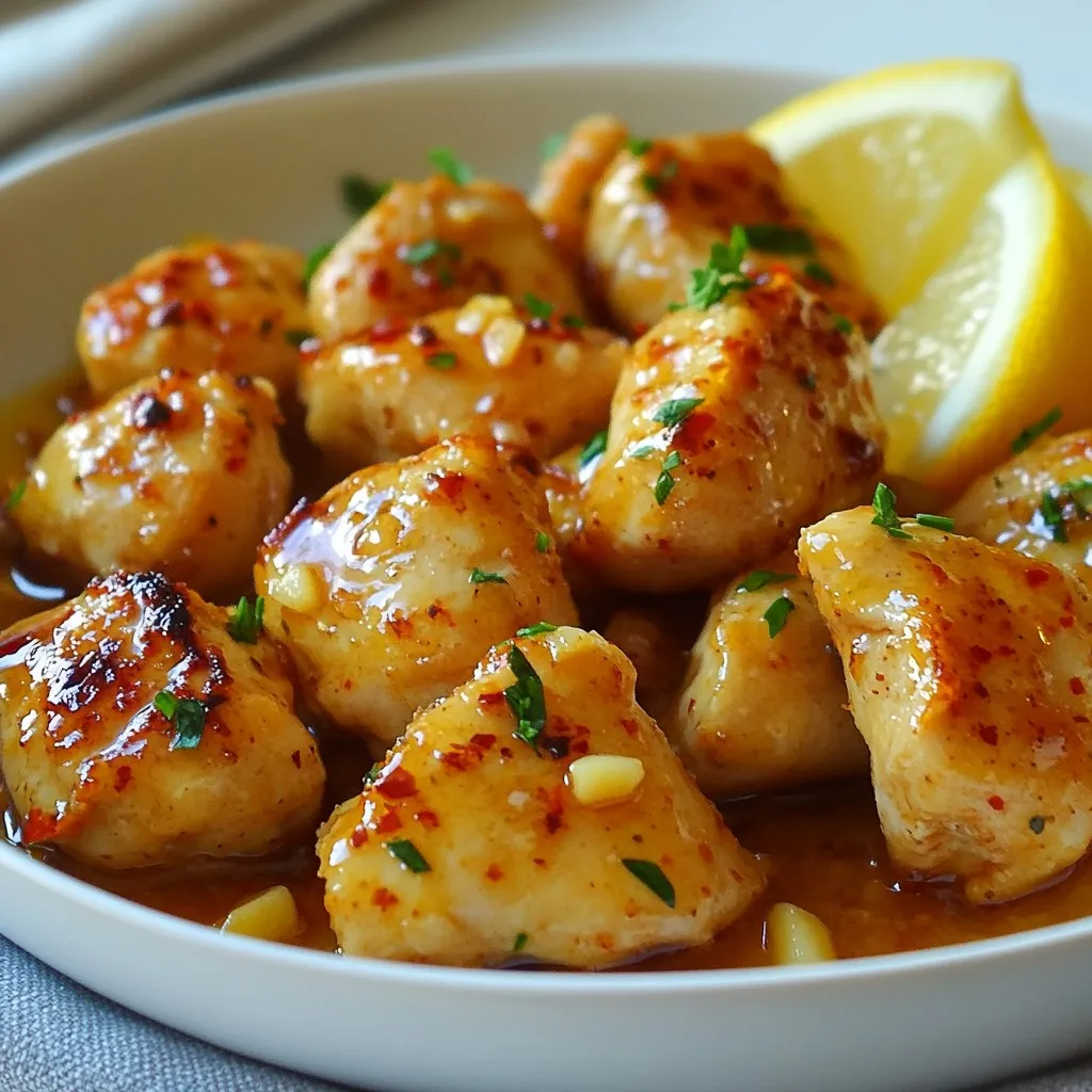 - Chicken: 1 lb boneless, skinless chicken breasts - Garlic: 6 cloves minced - Butter: 4 tablespoons unsalted - Seasoning: Salt, black pepper, paprika, dried thyme The main ingredients for Minute Garlic Butter Chicken Bites are simple yet flavorful. I use one pound of boneless, skinless chicken breasts. This cut cooks quickly and stays juicy. Next, I add six cloves of minced garlic. Garlic gives the dish its wonderful aroma and taste. For richness, I use four tablespoons of unsalted butter. It melts nicely and enhances the chicken's flavor. I season the chicken with salt, black pepper, paprika, and dried thyme. Paprika adds a mild warmth, while thyme brings a hint of earthiness. - Fresh parsley for garnish - Lemon wedges for serving Fresh parsley brightens the dish's look and taste. I chop two tablespoons and sprinkle it on top before serving. Lemon wedges are perfect on the side. A squeeze of lemon juice adds a zesty kick that complements the garlic butter. These ingredients come together to make a dish that is both easy and delicious. Each bite delivers rich flavors and a hint of brightness from the lemon. {{ingredient_image_2}} - Pat dry chicken pieces and season. Start by using paper towels to dry the chicken. This helps it brown well. Then, sprinkle paprika, salt, and black pepper on the chicken. Make sure each piece is covered evenly. - Heat butter in a skillet. Place a large skillet on medium heat. Add the unsalted butter and let it melt. Watch for it to foam; that means it is ready for cooking. - Cook chicken bites in skillet until golden. Carefully place the seasoned chicken into the skillet. Cook for about 3-4 minutes without stirring. This allows one side to turn a nice golden brown. After that, flip the chicken pieces over and cook for another 3-4 minutes. Ensure they are fully cooked and no longer pink. The chicken should reach an internal temperature of 165°F or 75°C. - Add garlic and sauté to fragrant perfection. Once the chicken is cooked through, lower the heat. Add minced garlic to the skillet. Sauté for 1-2 minutes until it turns fragrant and golden. Be careful not to burn the garlic, as that can ruin the flavor. - Toss with thyme and parsley. Sprinkle dried thyme over the chicken mixture. Stir gently to mix, making sure every piece is coated in that tasty garlic butter. - Serve with lemon wedges for added freshness. Remove the skillet from heat. Transfer the chicken bites to a serving platter. Add lemon wedges to the side. Guests can squeeze fresh lemon juice over the chicken for a bright, zesty flavor. - Cut chicken into similar-sized pieces. This helps them cook evenly. - Use a meat thermometer. Check that the chicken reaches 165°F for safety. - Adjust seasoning to fit your taste. More salt or pepper can really change the dish. - Try adding herbs or spices. Rosemary or cayenne can add a fun twist. These small steps can elevate your Minute Garlic Butter Chicken Bites. Enjoy the process! Pro Tips Pat the Chicken Dry: This helps to achieve a better sear and golden color on the chicken bites. Use Fresh Garlic: Freshly minced garlic provides a more vibrant flavor compared to pre-minced garlic. Don't Overcrowd the Pan: Cooking the chicken in a single layer ensures even cooking and browning. Serve Immediately: These chicken bites are best enjoyed fresh off the stove to maintain their juicy texture. {{image_4}} You can easily change the main protein in this dish. For a seafood twist, swap chicken for shrimp. Shrimp cooks fast and absorbs flavors well. If you prefer a plant-based option, use tofu instead. Make sure to press the tofu to remove excess moisture before cooking. Another option is to use ghee instead of butter. Ghee adds a rich, nutty flavor to the dish. This change works well if you want a deeper taste or are lactose-intolerant. To customize the heat level, add a pinch of red pepper flakes. This small change can bring warmth without overpowering the dish. If you like different herbs, try using oregano or basil. These herbs add a unique twist and can elevate the flavor profile. Experimenting with these variations can help you find your favorite version of garlic butter chicken bites. Don't hesitate to mix and match to suit your taste! After you enjoy your Minute Garlic Butter Chicken Bites, store any leftovers in the fridge. Make sure they cool down to room temperature first. This helps keep the chicken juicy. Use airtight containers to prevent air from getting in. This keeps your chicken bites fresh for up to three days. To reheat, you can use the stovetop or microwave. For the stovetop, place the chicken in a skillet over low heat. Stir it gently until warm. This method keeps the flavor and texture nice. If you use the microwave, set it to medium power. Heat in short bursts, checking every 30 seconds. This way, you avoid drying out the chicken. Enjoy your meal just like it was fresh! Can I make this recipe in advance? Yes, you can make these garlic butter chicken bites ahead of time. Cook the chicken as directed, then let it cool. Store it in an airtight container in the fridge for up to three days. When ready to eat, just reheat it gently on the stove. This keeps the chicken juicy. What sides pair well with garlic butter chicken bites? These chicken bites go well with many sides. Here are some great options: - Garlic mashed potatoes - Steamed broccoli - Rice pilaf - Crisp salad - Roasted vegetables These sides complement the rich flavors of the chicken. Can I double the recipe for a party? Absolutely! Doubling the recipe works well. Just use two pounds of chicken. You may need to cook it in batches. This way, the chicken can brown nicely without overcrowding the pan. How to make it gluten-free or dairy-free? To make this dish gluten-free, ensure your butter is gluten-free. For a dairy-free version, use olive oil or coconut oil instead of butter. The taste will still be great, and you won’t miss the dairy! This blog post shared a tasty garlic butter chick