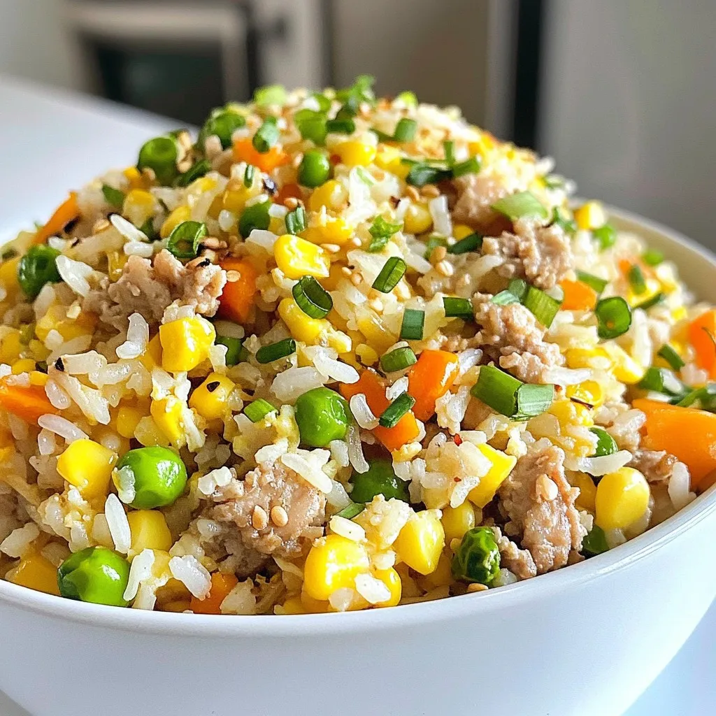 A delicious and easy fried rice recipe featuring ground chicken and mixed vegetables.