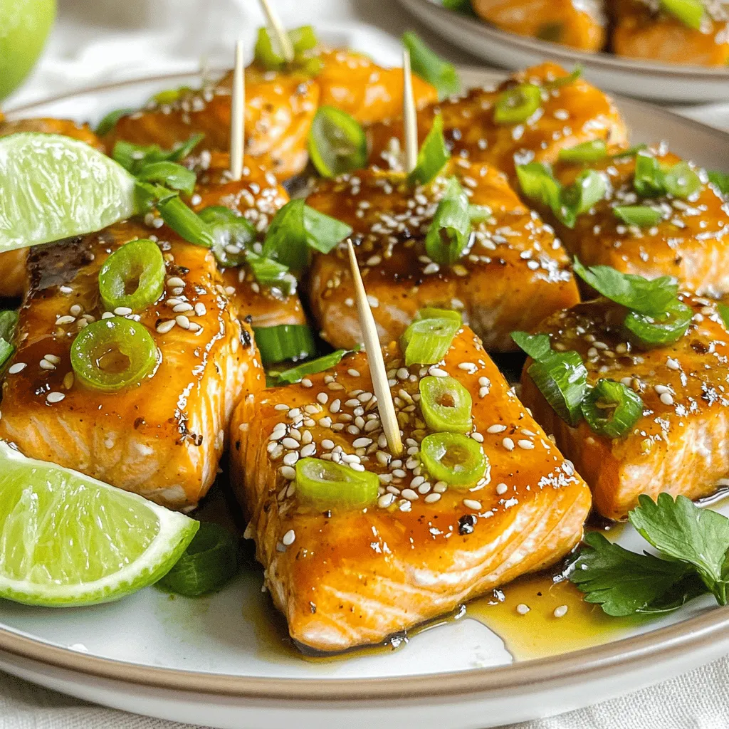 - 1 lb salmon fillet - 3 tablespoons honey - 2 tablespoons low-sodium soy sauce - 2 cloves garlic, finely minced - 1 tablespoon fresh ginger, freshly grated - 1 tablespoon extra virgin olive oil - 1 teaspoon sesame oil - 1/2 teaspoon freshly ground black pepper - 1/4 teaspoon red chili flakes (optional, for added heat) To make these bites truly special, you need fresh ingredients. The salmon fillet is the star here. I prefer skinless salmon for easy bites. Honey brings sweetness, while soy sauce adds saltiness. Garlic and ginger give it a punch. Olive oil helps with cooking, and sesame oil adds depth. Black pepper adds warmth, and red chili flakes can bring heat if you want it. - 2 green onions, thinly sliced - Toasted sesame seeds For garnishing, I always use green onions. They add color and a fresh taste. Toasted sesame seeds give a nice crunch. You can sprinkle both on top after cooking. - Fresh lime wedges - Additional spice options Want to add more flair? Fresh lime wedges are great for a zesty kick. You can choose other spices too. Experiment with what you love. To make the marinade, start by taking a mixing bowl. Add 3 tablespoons of honey, 2 tablespoons of soy sauce, and 2 minced garlic cloves. Then, mix in 1 tablespoon of freshly grated ginger. Next, pour in 1 tablespoon of extra virgin olive oil and 1 teaspoon of sesame oil. Finally, add 1/2 teaspoon of black pepper and 1/4 teaspoon of red chili flakes if you like some heat. Whisk it all together until it’s smooth. This step ensures that all the flavors blend perfectly. Now, it is time to marinate the salmon. Take 1 pound of skinless salmon fillet and cut it into uniform bite-sized pieces. Place the salmon into the marinade and toss it gently. Make sure every piece is well-coated. Let the salmon sit in the marinade for about 10 minutes. This time allows the flavors to soak into the fish, giving it a delicious taste. For cooking, first heat a nonstick skillet over medium-high heat. Allow the skillet to get hot. Once it’s ready, add a light drizzle of olive oil to coat the bottom. Carefully place the marinated salmon bites in a single layer in the skillet. Avoid overcrowding them. Cook the salmon for about 2-3 minutes on one side until it gets a nice caramelized look. Then, flip each piece gently and cook for another 1-2 minutes until the salmon is golden brown and fully cooked. After cooking, take the skillet off the heat. Transfer the salmon bites to a serving plate. For a beautiful garnish, sprinkle thinly sliced green onions and toasted sesame seeds over the top. This adds color and crunch. If you want more flavor, drizzle any remaining marinade that did not touch the raw salmon over the bites. This extra touch makes the dish even more tasty and appealing. To make a great marinade, balance sweetness and saltiness. You can adjust the honey and soy sauce to fit your taste. If you like it sweeter, add more honey. For a saltier kick, increase the soy sauce. Fresh ingredients shine the most. Use fresh garlic and ginger for a bright flavor. Dried herbs can work, but they lack the same punch. Fresh herbs add life to the dish. Avoid overcooking the salmon. Cook it for just 2-3 minutes on one side. Flip it gently and cook for another 1-2 minutes. The goal is a golden-brown color. Caramelization adds a nice crunch and flavor. Keep the heat at medium-high to achieve this. A nonstick skillet helps the salmon cook evenly. For plating, use a stylish platter. Arrange the salmon bites neatly and add toothpicks for easy eating. Garnish with green onions and sesame seeds for a colorful look. Add lime wedges for a burst of zest. These pair well with rice or a fresh salad. You can also serve them with a light drink, like iced tea or sparkling water. {{image_4}} You can switch up the taste of honey garlic salmon bites. To make a spicy version, add more red chili flakes. This gives the dish a nice kick. For a citrus twist, try a marinade with orange or lemon juice. Both options enhance the flavors and keep the dish fresh. If you need gluten-free options, use tamari instead of soy sauce. It tastes great and still keeps the flavor you want. For low-calorie alternatives, reduce the honey. You can also use a sugar substitute. This way, you enjoy the dish without extra calories. You can serve salmon bites skewered or unskewered. Skewering makes them fun for parties. It also helps with easy eating. For a more formal meal, serve them unskewered. They work well as an appetizer or a main dish. Just pair them with sides like rice or veggies for a complete meal. To keep your honey garlic salmon bites fresh, store them in the fridge. Place them in an airtight container. Wrap them well with plastic wrap for extra protection. They will last for up to three days. Always let the salmon cool down to room temperature before storing. This step helps prevent excess moisture, which can make the salmon soggy. You can freeze salmon bites for longer storage. First, allow the cooked bites to cool completely. Then, arrange them on a baking sheet in a single layer. This helps prevent them from sticking together. Freeze for about two hours, then transfer them to a freezer-safe bag or container. Label it with the date. Frozen salmon bites can last up to three months. When you are ready to enjoy them, thaw the bites in the fridge overnight. This slow thaw keeps the texture nice. If you need them quick, you can use the microwave on a low setting for a few minutes. Make sure they are not still frozen in the middle. To reheat salmon bites, use gentle heat to avoid drying them out. The best method is to use a skillet. Heat it over medium-low heat and add a splash of oil. Place the salmon bites in the pan and warm them for about 3-4 minutes, flipping halfway through. If you prefer the microwave, use a microwave-safe plate. Cover the bites with a damp paper towel. Heat on medium power for 30 seconds, check, and repeat if needed. Always check that they are hot all the way through
