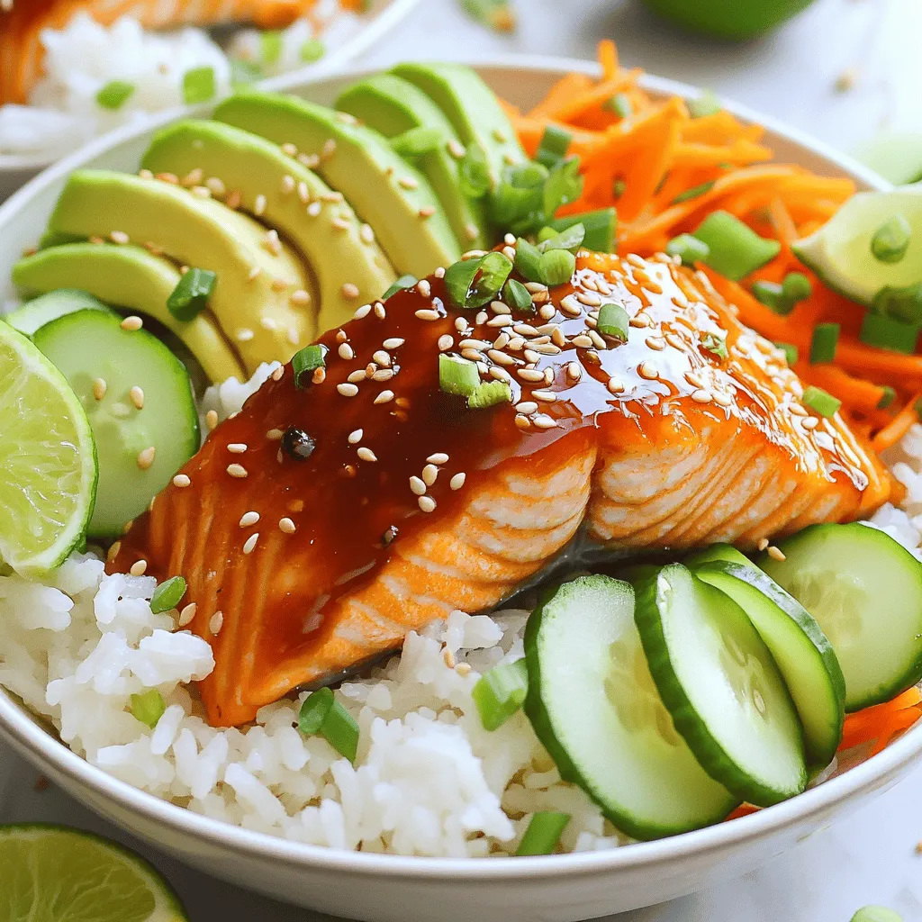 Make your bowls look great by layering the ingredients. Start with fluffy jasmine rice as the base. Then, arrange the vegetables in a colorful way. Place the salmon on top for a beautiful finish. Drizzle the extra sauce over the salmon and veggies. This adds shine and flavor. Finally, serve with lime wedges on the side. This way, each person can add their own zesty touch.