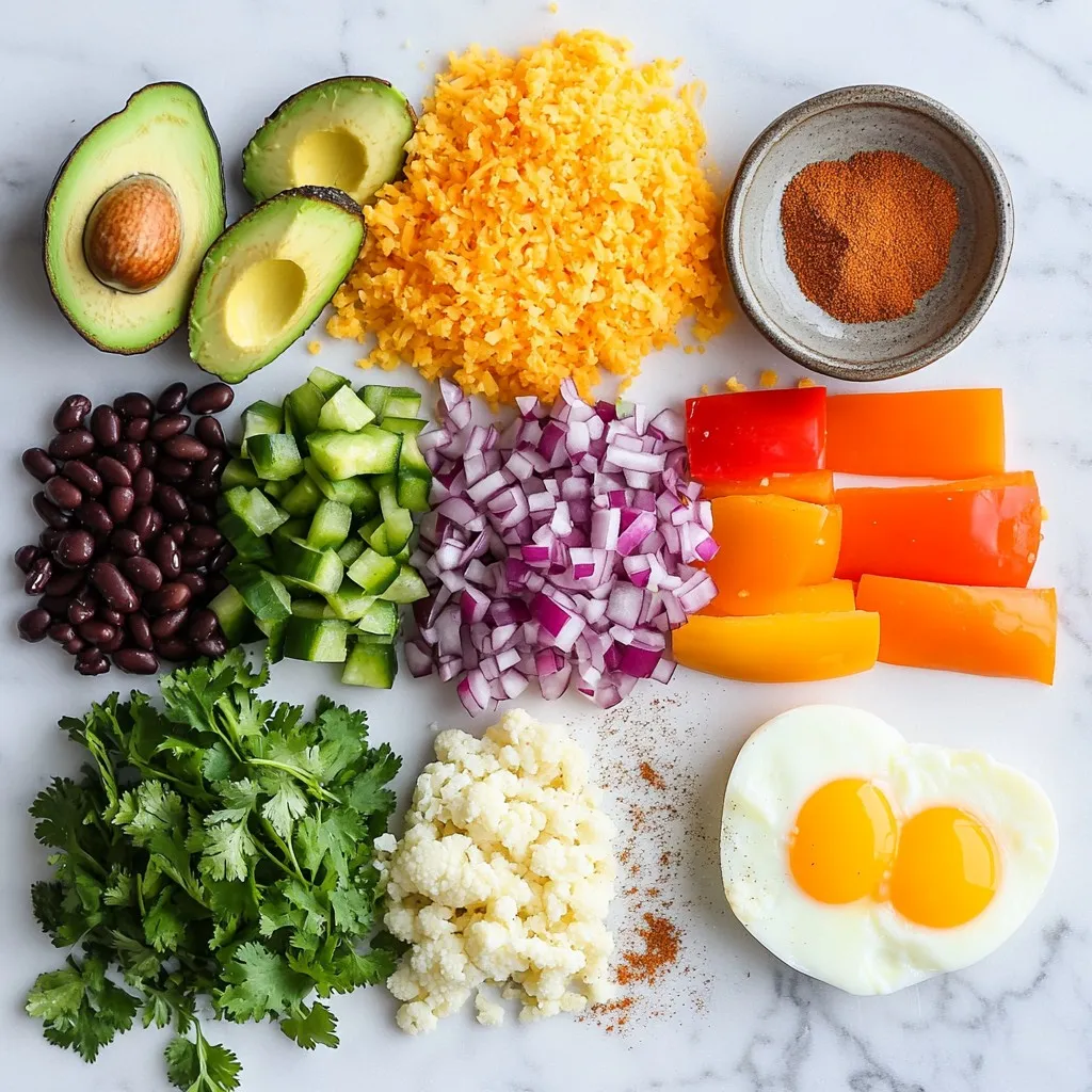This breakfast bowl offers many health benefits. Eggs are a great source of protein. They help build muscle and keep you full. Riced cauliflower is low in carbs and rich in fiber. It aids digestion and can help with weight loss. Bell peppers add vitamins A and C. They boost your immune system. Black beans provide protein and keep your heart healthy. Avocado brings healthy fats to the meal. These fats can lower bad cholesterol and improve heart health. Fresh cilantro adds flavor and may help detox your body.