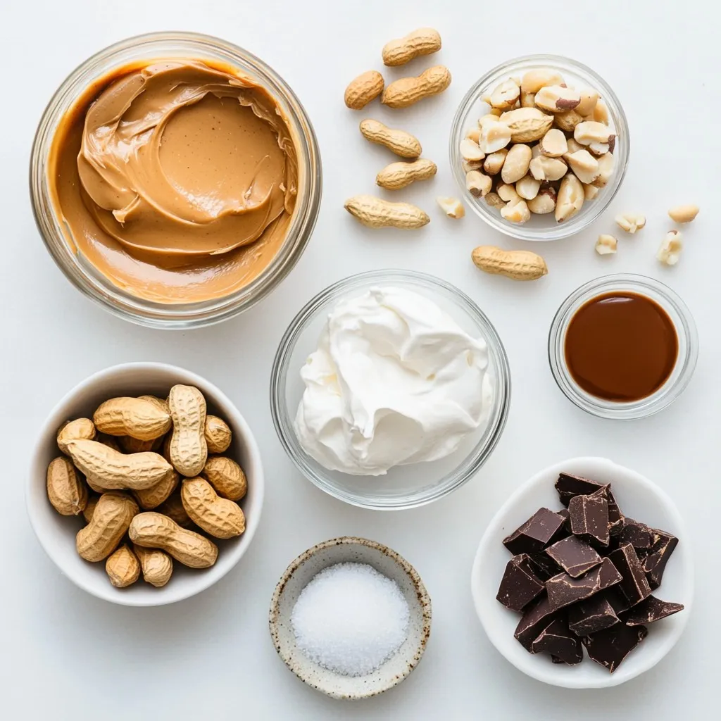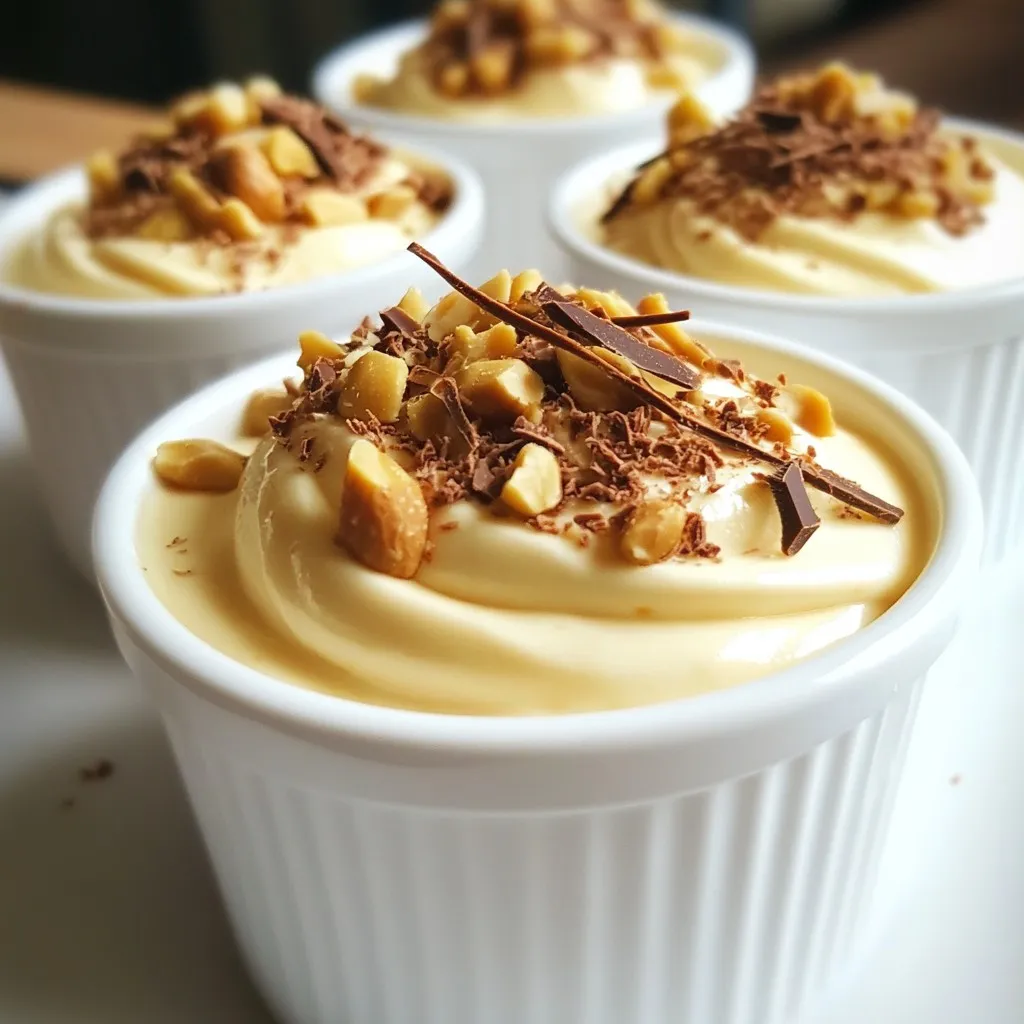 - 1 cup creamy peanut butter - 1 cup heavy whipping cream - ½ cup powdered sugar - 1 teaspoon pure vanilla extract - Pinch of sea salt For this Minute Peanut Butter Mousse, I use five main ingredients. First, creamy peanut butter adds rich flavor and smooth texture. Heavy whipping cream is key for lightness. The powdered sugar sweetens the mousse just right. Pure vanilla extract adds depth, while a pinch of sea salt enhances all the flavors. - Chopped roasted peanuts - Dark chocolate shavings - Freshly whipped cream You can make this mousse even better with toppings. Chopped roasted peanuts give a nice crunch. Dark chocolate shavings add a touch of luxury. Freshly whipped cream can make it feel extra special. Feel free to mix and match these toppings to create your perfect dessert! {{ingredient_image_2}} First, grab a large mixing bowl. Add 1 cup of creamy peanut butter, ½ cup of powdered sugar, 1 teaspoon of pure vanilla extract, and a pinch of sea salt. Use a whisk to mix these ingredients together. Blend until smooth and creamy. Make sure there are no lumps. This step is very important for a great texture. Next, take a separate bowl. Pour in 1 cup of heavy whipping cream. Using an electric mixer or a whisk, whip the cream. Keep going until soft peaks form. This should take about 2-3 minutes. Be careful! If you whip too much, the cream can turn into butter. You want it light and airy. Now it’s time to bring it all together. Gently fold the whipped cream into the peanut butter mixture. Use a spatula for this. Carefully incorporate the whipped cream so that it stays fluffy. This light texture is what makes the mousse special. Once mixed, spoon the mousse into individual cups or bowls. Fill each about three-quarters full. Then, place them in the refrigerator. Chill for at least 10 minutes. This helps the mousse set and makes the flavors even better. Before serving, you can add toppings like chopped roasted peanuts, dark chocolate shavings, or whipped cream for fun. Enjoy your quick and easy dessert! To avoid overwhipping cream, keep an eye on the texture. Start by using chilled heavy cream. When you whip, do it on medium speed. This helps create soft peaks. Stop whipping as soon as you see soft peaks forming. If you go too far, the cream can turn grainy. If this happens, it won't mix well with your peanut butter. Remember, light and airy is the goal here! You can add different flavors to your mousse for a twist. Try mixing in cocoa powder for a chocolate version. A bit of espresso powder gives a nice coffee kick. For a fruity touch, fold in some raspberry puree. You can even add a hint of cinnamon for warmth. Don’t be afraid to experiment with flavors until you find your favorite! Presentation matters when serving mousse. Use clear glass cups to show off the creamy layers. This lets people see the rich color and texture. Top with chopped roasted peanuts for a nice crunch. Dark chocolate shavings add elegance and richness. A fluffy dollop of whipped cream can make it look even more inviting. Arrange toppings artfully on top for a professional touch. Pro Tips Use Room Temperature Peanut Butter: This will make it easier to blend with the other ingredients, ensuring a smooth and creamy mousse. Watch the Cream Carefully: When whipping the cream, stop as soon as soft peaks form to maintain a light and airy texture in the mousse. Chill for Best Results: Allowing the mousse to chill for at least 10 minutes helps to enhance the flavors and set the texture perfectly. Experiment with Toppings: Get creative with toppings! Try adding crushed cookies, a drizzle of caramel, or even a sprinkle of sea salt for extra flavor contrast. {{image_4}} You can easily turn this mousse into a chocolate delight. Just add cocoa powder or melted chocolate to the peanut butter mix. For a thick and rich mousse, use about ¼ cup of cocoa powder or ½ cup of melted chocolate. This will give your mousse a deep chocolate flavor while keeping the peanut butter taste. If you need a nut-free option, try using sun butter. Sun butter is made from sunflower seeds and has a similar creamy texture as peanut butter. It tastes great and is safe for those with nut allergies. Use the same amount of sun butter as you would peanut butter in the recipe. For a lighter mousse, swap the heavy cream with Greek yogurt. Greek yogurt adds creaminess without the extra fat. Use 1 cup of Greek yogurt instead of the heavy cream. This change will keep the mousse fluffy while adding a boost of protein. Plus, it will taste delicious! To store leftover mousse, put it in an airtight container. This keeps it fresh and tasty. Make sure to seal the container tightly. Place it in the fridge. Enjoy it within three days for the best flavor. You can freeze peanut butter mousse, but it may change in texture. To freeze, use a freezer-safe container. Leave some space at the top, as the mousse will expand when it freezes. Thaw it in the fridge before serving. It is best to eat it within a month. Peanut butter mousse lasts about three to four days in the fridge. If stored well, it keeps its taste and texture. Always check for any off smells or changes in color before eating. Yes, you can make peanut butter mousse ahead of time. I suggest you prepare it the day before. After you whip and fold the mousse, store it in the fridge. This allows flavors to develop and blend. Just remember to cover it tightly with plastic wrap or a lid. It stays fresh and tasty. If you want a lighter mousse, try using coconut cream or whipped coconut milk. Both options give a nice texture without the heaviness. You can also use Greek yogurt for a healthier choice. It adds creaminess and protein while cutting some fat. To adjust sweetness, start with less powdered sugar. You can always add more later. Taste as you mix, and when it feels right, stop. If you want a sweeter mousse, add a little more sugar. You can also use honey or maple syrup for natural sweetness. You can use natural pe