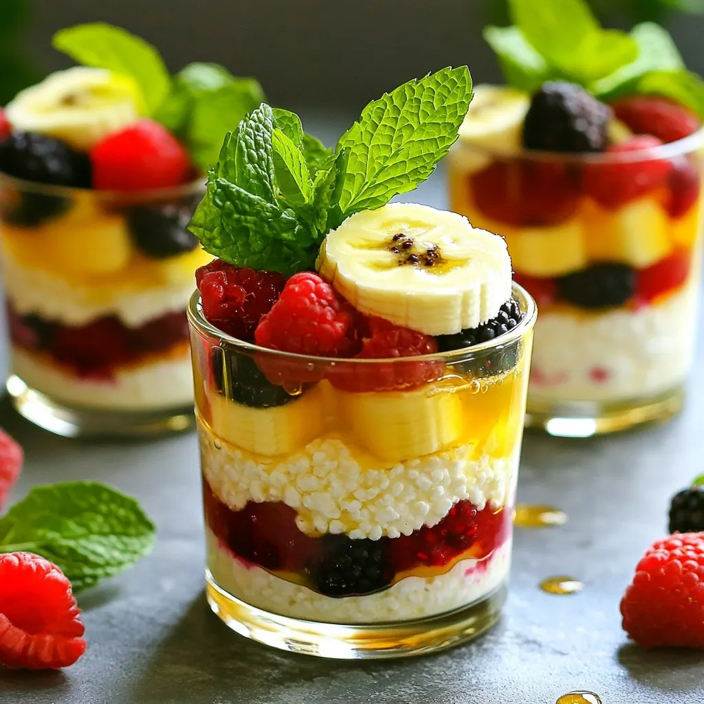 - 1 cup of cottage cheese - 1 ripe banana, sliced - 1/2 cup of frozen mixed berries (a blend of strawberries, blueberries, and raspberries) - 1 tablespoon of honey or maple syrup (optional for added sweetness) - 1/2 cup of almond milk (or your preferred milk variety) - 1 tablespoon of chia seeds - A pinch of ground cinnamon - Fresh mint leaves for garnish (optional) Cottage cheese is rich in protein. It helps build muscles and keeps you full. Bananas add natural sweetness and provide potassium for better heart health. Frozen mixed berries are packed with antioxidants. They fight inflammation and support your immune system. Honey or maple syrup offers quick energy. Use them for a touch of sweetness. Almond milk is low in calories, making it a great choice for a lighter drink. Chia seeds are full of fiber and omega-3 fatty acids. They help digestion and support heart health. Cinnamon adds flavor and may help with blood sugar control. Lastly, fresh mint leaves give a burst of freshness and make the cups look pretty. You can swap cottage cheese for Greek yogurt for a tangy twist. Any fruit, like mango or pineapple, can replace the banana. For dairy-free options, use coconut milk instead of almond milk. You can also skip the honey if you prefer a less sweet drink. Add nuts or seeds for extra crunch or protein. You can mix in spinach for a green smoothie that boosts vitamins. The options are endless, so feel free to get creative! To start, gather your ingredients. You need one cup of cottage cheese, one ripe banana, and half a cup of frozen mixed berries. Place these into a high-powered blender. Add half a cup of almond milk. If you want some sweetness, include one tablespoon of honey or maple syrup. Then, toss in one tablespoon of chia seeds and a pinch of ground cinnamon. Blend everything on high speed. Keep blending until it’s smooth and creamy. Make sure there are no lumps left. If your smoothie seems too thick, add a little more almond milk. Blend again until you reach your desired consistency. If you like it sweeter, taste and adjust. You can add more honey or syrup. Blend quickly to mix it in. The key is to ensure all ingredients blend well together. Once blended, pour the smoothie mixture into small cups or glasses. Fill them to your liking. Now, here’s the secret: chill them in the refrigerator for at least 10 minutes. This helps the chia seeds absorb liquid. As a result, the smoothie thickens and gets a great texture. Chilling also makes the smoothie even more refreshing. To make your smoothie cups just right, taste them before serving. If you want more sweetness, add a dash of honey or maple syrup. Blend again for a few seconds. Remember, sweetness varies by fruit. Some bananas are sweeter than others. Adjust based on your fruit's taste. Garnishing adds fun and flair to your smoothie cups. Use fresh mint leaves for a pop of color and flavor. You can also sprinkle some chia seeds on top. This adds crunch and looks nice. If your kids help, they will enjoy making it pretty! Sometimes, the mix may not blend well. If it’s too thick, add more almond milk. This helps achieve a smooth texture. If you see lumps, blend longer. A high-powered blender works best for this. If you have a regular blender, you might need to stop and stir the mix. Don't worry; blending is key to a creamy smoothie! {{image_4}} You can easily change the taste of your smoothie cups by using different fruits. Here are some ideas: - Mango: Use 1 cup of frozen mango instead of mixed berries. - Peach: Swap in fresh or frozen peaches for a sweeter flavor. - Pineapple: Add 1/2 cup of frozen pineapple for a tropical twist. Each fruit adds its own unique flavor and can change the smoothie’s color too. You can mix and match to find your favorite! If you want a dairy-free or vegan option, you can make simple swaps. Try these: - Cottage Cheese: Use 1 cup of silken tofu or a dairy-free yogurt. - Almond Milk: You can use any plant-based milk like oat or soy milk. - Honey: Replace honey with agave syrup or maple syrup for sweetness. These changes keep your smoothie tasty while fitting your diet. Adding superfoods can boost the health benefits of your smoothie cups. Here are some ideas: - Spinach: Toss in a handful of fresh spinach for extra vitamins. - Protein Powder: Mix in a scoop of your favorite protein powder for a protein boost. - Nut Butters: Add 1 tablespoon of almond butter or peanut butter for creaminess and flavor. These superfoods not only enhance the nutrition but also make your smoothies more filling. Enjoy experimenting! To store leftover smoothie cups, first cover them tightly. Use plastic wrap or a lid. Place the cups in the fridge. They can stay fresh for up to two days. If you want to keep them longer, consider freezing. Pour the smoothie into ice cube trays or freezer-safe containers. This way, you can enjoy them later. To keep your ingredients fresh, focus on storage. Store cottage cheese in its original container, sealed tight. Keep it in the coldest part of your fridge. Bananas should stay at room temperature. Avoid placing them near other fruits to prevent early ripening. For berries, wash them only before use. Store them in a breathable container in the fridge. For smoothie cups, reheating isn’t needed. They taste best cold. If you prefer a warm drink, blend the smoothie again. Warm it gently on low heat, but do not boil. You can also use leftovers in other recipes. Pour them into pancakes or mix them in oatmeal for added flavor and protein. Yes, you can make these smoothie cups ahead of time. Simply blend the ingredients and pour them into cups. Cover them and place them in the fridge. They will stay fresh for up to two days. Just remember to stir or shake well before serving. This way, you get a quick and tasty snack on busy days. Cottage cheese is a great addition to smoothies. It is high in protein, which helps you feel full. It has calcium for strong bones and teeth. Cottage cheese also contai