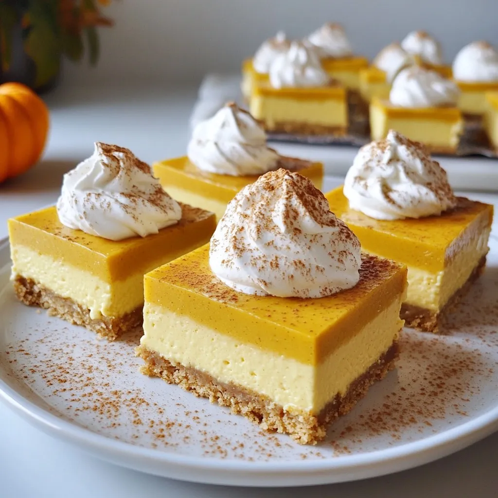 Delicious and creamy pumpkin cheesecake bars that require no baking, perfect for fall gatherings.