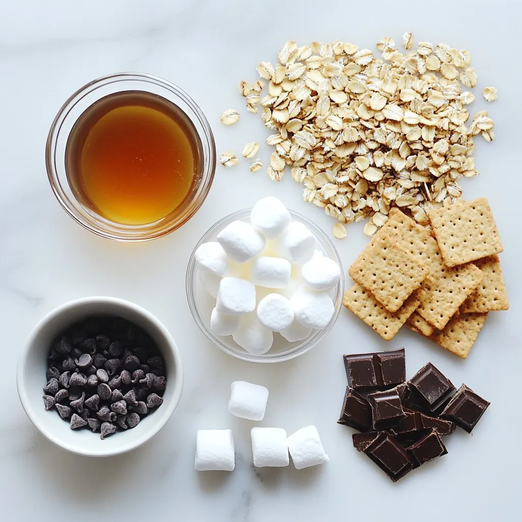 These ingredients create a mix of textures and flavors. The oats provide a hearty base. The nut butter adds creaminess. Honey or maple syrup gives sweetness. The chocolate chips and marshmallows bring that classic s’mores taste. Flaky sea salt enhances all the flavors.