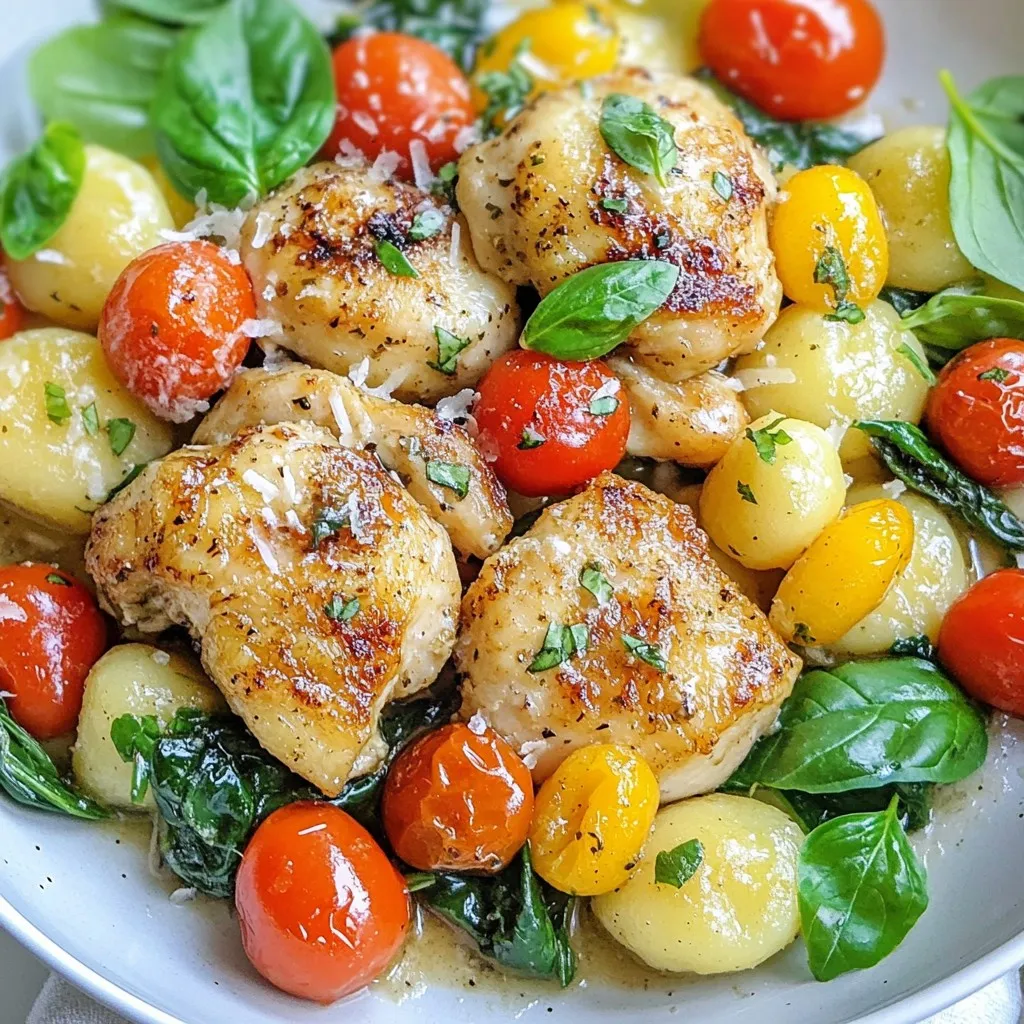 A delicious one-pan meal featuring tender chicken, gnocchi, and fresh vegetables, all cooked together for a flavorful dish.