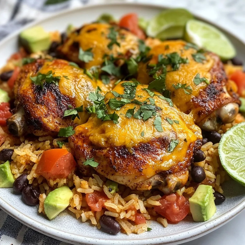 A flavorful one-pan dish featuring seared chicken thighs, seasoned rice, and melted queso cheese.