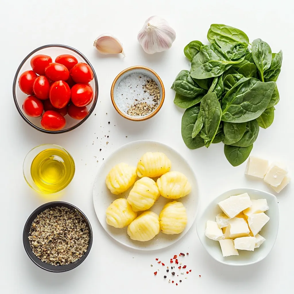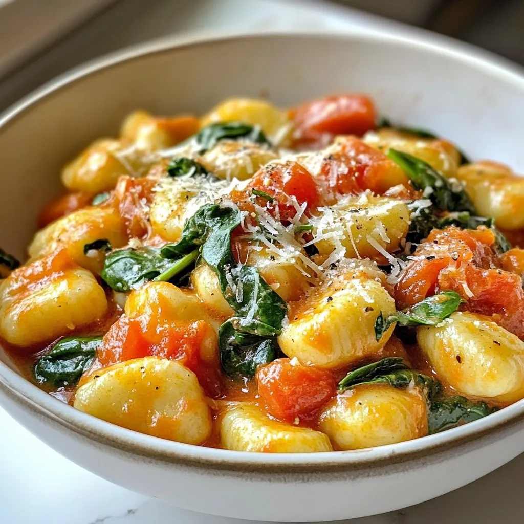 A delicious and easy one-pan dish featuring gnocchi, tomatoes, and spinach, perfect for a quick meal.