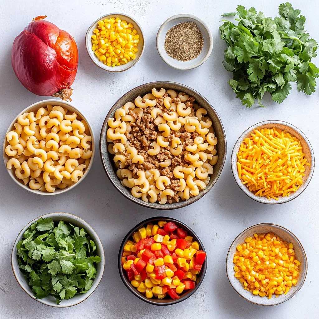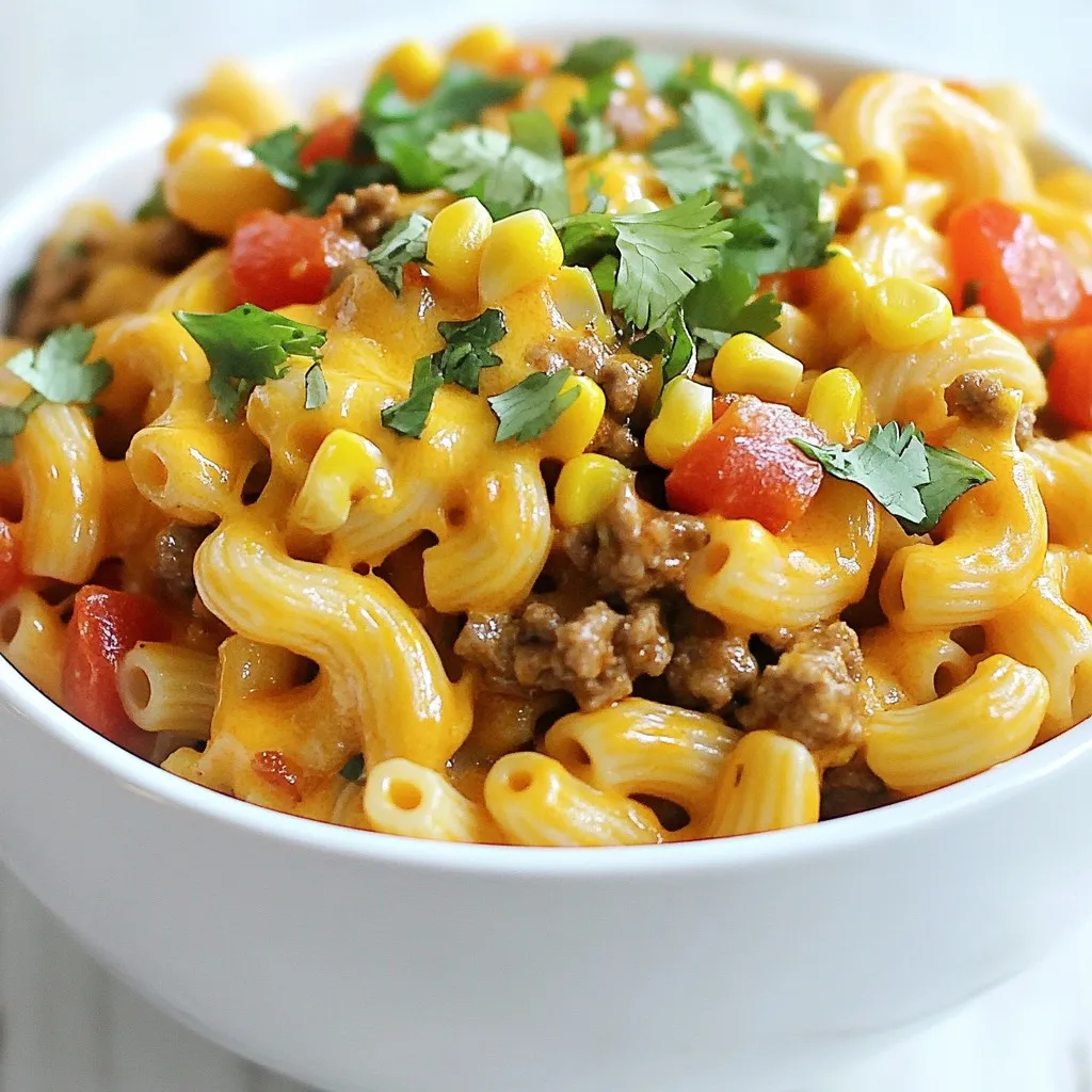 - 1 lb ground beef or turkey - 8 oz (approximately 2 cups) elbow macaroni - 1 can (15 oz) diced tomatoes with green chilies These three main ingredients form the base of your One-Pot Cheesy Taco Pasta. Ground beef or turkey brings protein and flavor. Elbow macaroni soaks up the yummy sauce. Diced tomatoes with green chilies add a nice kick. - 1 packet taco seasoning - 1.5 cups shredded cheddar cheese - 1 cup corn (freshly frozen or canned) - 1 medium onion, finely diced - 2 cloves garlic, minced - 2 cups chicken or vegetable broth - Salt and black pepper to taste - 1 tablespoon olive oil Taco seasoning gives your dish that classic taco flavor. Shredded cheddar cheese melts into a creamy topping. Corn adds sweetness and texture. Onion and garlic enhance the base flavors. Broth makes the sauce rich and tasty. - Fresh cilantro, chopped - Sour cream - Avocado slices Garnishes like fresh cilantro brighten up the dish. A dollop of sour cream adds creaminess. Avocado slices bring a creamy, healthy touch. These extras make your meal look great and taste even better. {{ingredient_image_2}} 1. Heat a large pot over medium heat. Add one tablespoon of olive oil. 2. Once the oil shimmers, add a finely diced medium onion. Sauté for 3-4 minutes. The onion should become soft and clear. 3. Stir in two minced cloves of garlic. Add one pound of ground beef or turkey. 4. Cook the meat for 5-7 minutes. Break it up with a wooden spoon until it is brown. Drain any fat if needed. 1. Sprinkle one packet of taco seasoning over the meat. Mix well to coat the meat evenly. 2. Pour in two cups of chicken or vegetable broth. Add one can of diced tomatoes with green chilies. 3. Stir everything until it is well combined. 4. Bring the mixture to a boil over high heat. 5. Once boiling, lower the heat to medium-low. Add 8 ounces of elbow macaroni and one cup of corn. Stir to make sure the pasta is covered by the liquid. 1. Cover the pot with a lid. Let it simmer for about 10-12 minutes. 2. Stir occasionally to stop the pasta from sticking to the pot. Cook until the pasta is soft and most of the liquid is gone. 3. Remove the pot from the heat. Stir in 1.5 cups of shredded cheddar cheese until it melts. 4. Taste the pasta and add salt and black pepper if needed. 5. Serve hot, garnished with chopped cilantro if you like. Enjoy your meal! To prevent pasta from sticking, stir it often while it cooks. This helps keep it separate. You can also add a splash of olive oil to the water before you add the pasta. Taste your dish as you cook. This way, you can adjust the seasoning to your liking. You might want to add a bit more salt or taco seasoning for extra flavor. Get creative with garnishes! Top your pasta with extra cheese, sour cream, or sliced avocado. Fresh cilantro adds a nice touch too. For sides, consider serving tortilla chips or a simple green salad. A cold drink, like lemonade or a light beer, pairs well with this dish. Using pre-cooked meat can really speed things up. You can find cooked beef or turkey at the store. This saves time on prep and cooking. For busy days, meal prep is key. Cook a double batch and store half for later. Just reheat it when you're ready to eat! Pro Tips Use Fresh Ingredients: Freshly chopped onions and garlic enhance the flavor of the dish significantly, making the pasta more aromatic and delicious. Customize Your Protein: Feel free to substitute the ground beef or turkey with plant-based alternatives or even shredded chicken for a different flavor profile. Cheese Choices: Experiment with different types of cheese, such as pepper jack for a spicy kick or a blend of cheeses for a richer taste. Leftover Magic: This dish reheats well, making it perfect for leftovers. Just add a splash of broth when reheating to restore creaminess. {{image_4}} You can easily switch ground turkey for ground beef. Turkey is leaner and can cut calories. For pasta shapes, try penne, rotini, or even gluten-free options. Each shape holds the sauce differently, adding a fun twist to your dish. Adding veggies boosts nutrition and flavor. Consider mixing in bell peppers, zucchini, or spinach. You can also add beans for protein. Black beans or pinto beans work well. Just rinse them and stir them in when you add the pasta. Want to make it vegetarian? Use a plant-based meat substitute instead of beef or turkey. For a vegan option, skip the cheese or use a vegan cheese. You can also find gluten-free pasta to fit your needs. Enjoy your meal, no matter your diet! Store leftovers in an airtight container. Cool the pasta to room temperature first. This helps to keep it fresh. The pasta stays good for about 3 to 4 days in the fridge. If you are not sure, check for any off smells or changes in texture. To freeze the dish, let it cool completely. Transfer it to a freezer-safe container. Make sure to leave some space for expansion. You can freeze it for up to 2 months. When you want to eat it, thaw it overnight in the fridge. For reheating, you can use the microwave or stovetop. In the microwave, heat in short bursts. Stir often to ensure even heating. On the stovetop, add a splash of broth or water to restore creaminess. Stir frequently until heated through. This will help keep your pasta soft and creamy. Making One-Pot Cheesy Taco Pasta is quick! It takes about 10 minutes to prep. Cooking will take around 20 minutes. So, in just 30 minutes, you can serve a warm, tasty dish. Yes, you can easily make this dish vegetarian! Just swap ground beef with black beans or lentils. You can also use mushrooms for a meaty texture. Adjust the taco seasoning to keep the flavor strong. This dish pairs well with many sides. Try a fresh salad for crunch. You can also serve tortilla chips for a fun crunch. If you want something warm, garlic bread is a great option! Absolutely! While cheddar adds a nice flavor, you can mix it up. Monterey Jack or pepper jack will add a great kick. You can even try cream cheese for a creamy texture. Get creative with you
