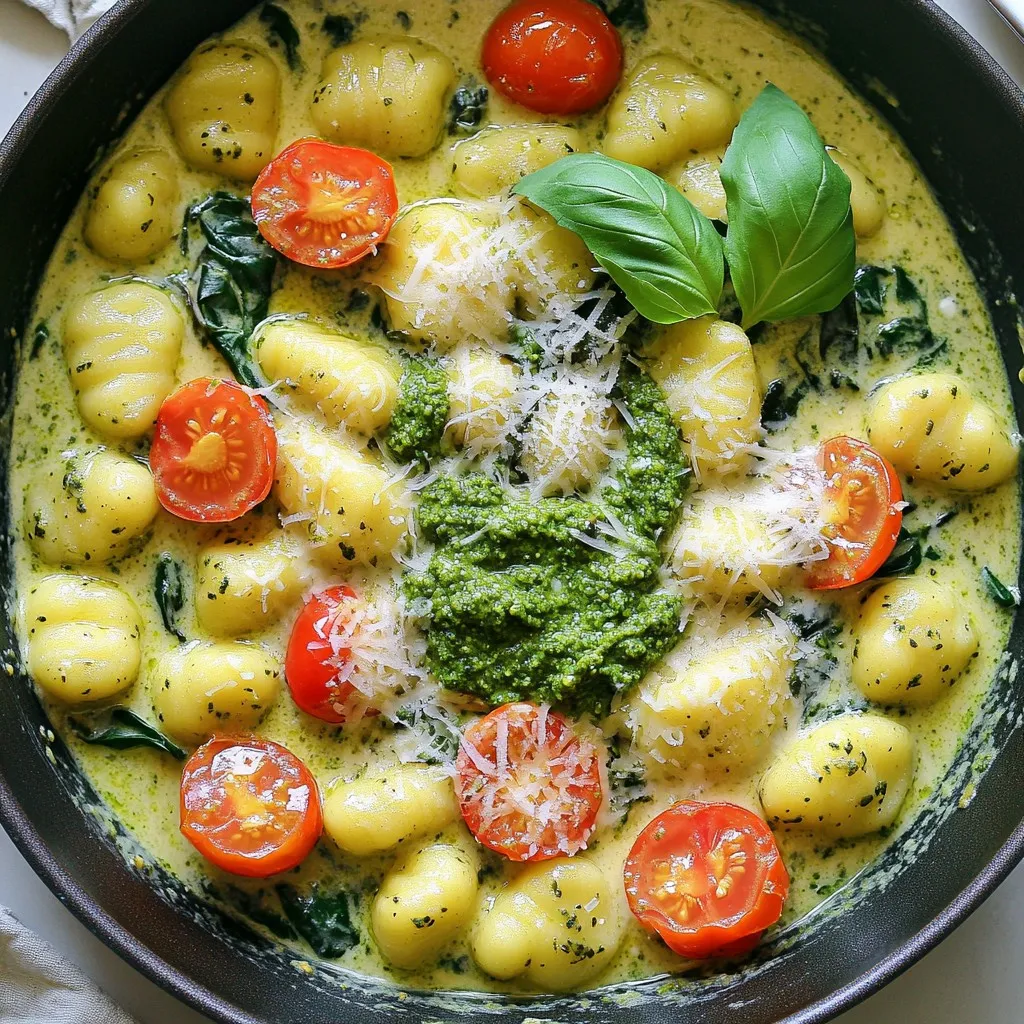 For a beautiful presentation, serve the creamy gnocchi in shallow bowls. This shows off the colors. Top each dish with fresh basil leaves and extra Parmesan. You can also drizzle a little olive oil on top. This adds shine and flavor. A sprinkle of black pepper can add a nice touch, too!