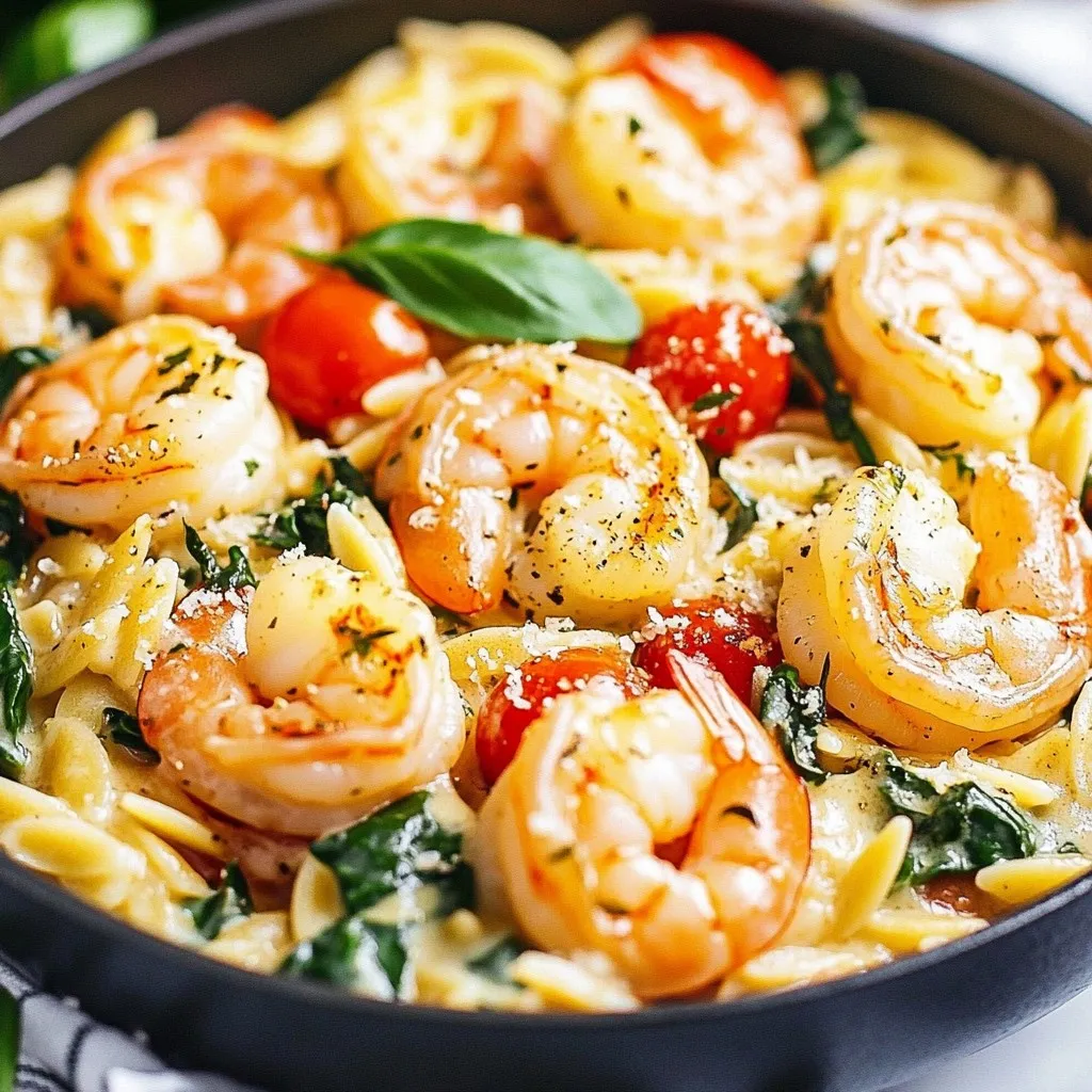 A delicious and creamy one-pot dish featuring shrimp, orzo pasta, and fresh vegetables.