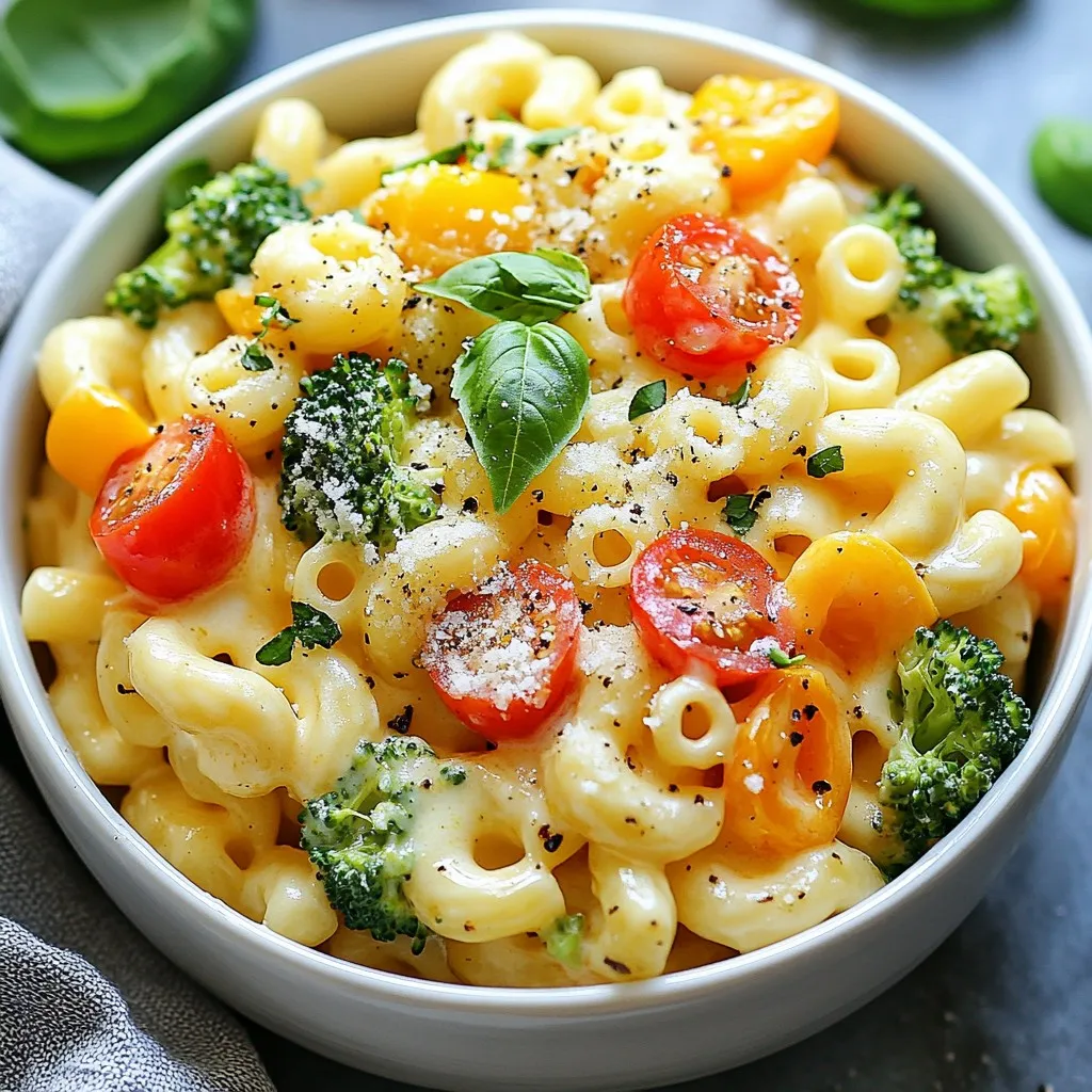 A creamy and colorful mac and cheese dish packed with fresh vegetables.