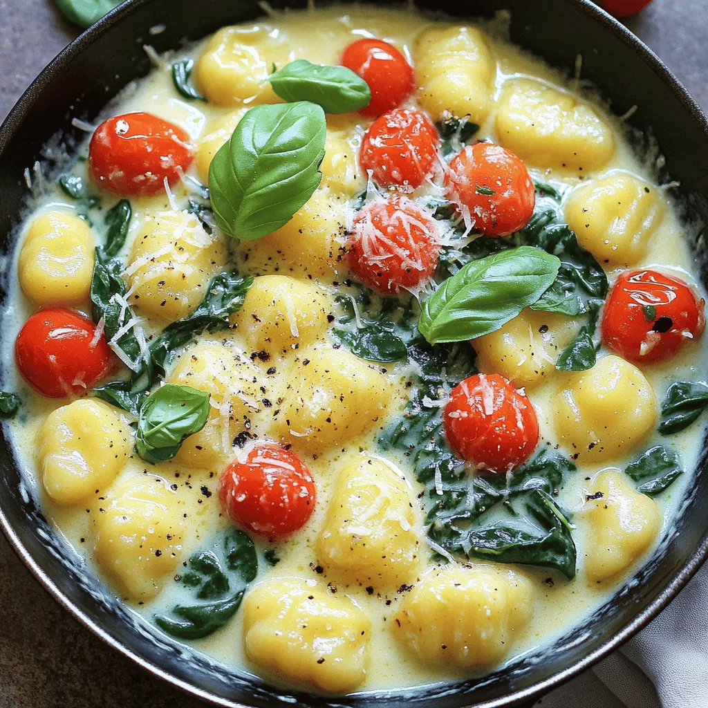 - 1 package (16 oz) of potato gnocchi - 2 tablespoons of olive oil - 3 cloves of garlic, finely minced - 1 cup of cherry tomatoes, halved - 2 cups of fresh spinach - 1 cup of heavy cream - 1/2 cup of freshly grated Parmesan cheese To make One Skillet Creamy Tuscan Gnocchi, you need basic ingredients. Start with potato gnocchi. This soft pasta is the star of the dish. Olive oil adds flavor and helps with cooking. Garlic gives a rich aroma. Cherry tomatoes add sweetness and color. Fresh spinach brings a healthy touch. Heavy cream creates that creamy texture. Finally, Parmesan cheese adds a savory kick. - 1/2 teaspoon of Italian seasoning - Salt and pepper to taste - Fresh basil leaves for garnish Seasonings make the dish shine. Italian seasoning brings warmth and depth. Salt and pepper enhance all the flavors. Fresh basil leaves make it look and taste fresh. They add a nice pop of green. - Serve the creamy gnocchi in individual bowls. - Drizzle with extra olive oil. - Sprinkle with additional Parmesan cheese. For plating, use individual bowls for a nice touch. Drizzling olive oil adds richness. A sprinkle of Parmesan cheese gives great flavor. Pair this dish with a simple salad or garlic bread. A light white wine also works well. Enjoy this delightful meal that feels fancy but is easy to make! - Mincing garlic: Start by peeling the garlic cloves. Use a sharp knife to chop them finely. Rock the knife back and forth to get small pieces. This way, the garlic releases more flavor. - Halving cherry tomatoes: Rinse the tomatoes under cold water. Use a sharp knife to cut each tomato in half. Hold the tomato steady with one hand and slice through gently. - Sautéing garlic and tomatoes: Heat 2 tablespoons of olive oil in a large skillet over medium heat. When the oil is hot, add the minced garlic. Stir it for about 30 seconds. You want it fragrant but not brown. Add the halved cherry tomatoes next. Cook them for 3-4 minutes. Stir occasionally until they soften and release juices. - Wilting spinach: Once the tomatoes are soft, add 2 cups of fresh spinach to the skillet. Stir it in and let it cook for about 2-3 minutes. The heat will help it wilt down. Mix well so the spinach blends with the tomatoes. - Cooking gnocchi: While the spinach wilts, cook 1 package of potato gnocchi according to the package instructions. Once they float, they are done. Drain them and set aside. - Mixing in heavy cream and cheese: After the spinach is wilted, reduce the heat to low. Pour in 1 cup of heavy cream and stir gently. Mix until smooth. Add the cooked gnocchi, 1/2 cup of grated Parmesan cheese, and 1/2 teaspoon of Italian seasoning. Toss everything together to coat the gnocchi. Season with salt and pepper to taste. Let it simmer for 2-3 minutes to blend the flavors. - To avoid overcooking the spinach, add it last. Cook it just until it wilts. This keeps it bright and fresh. - To ensure the gnocchi won’t stick together, cook them in plenty of salted water. Stir them gently while they cook. Drain them well before adding to the sauce. - You can add a pinch of red pepper flakes for heat. A splash of lemon juice brightens the dish. Try adding sun-dried tomatoes for extra flavor. - If you need cheese substitutes, try using Pecorino Romano or a vegan cheese option. Both melt well and add great taste. - Serve the creamy gnocchi in individual bowls. Drizzle a little extra olive oil on top for shine. A sprinkle of additional Parmesan cheese adds a nice touch too. - To store leftovers, place them in an airtight container. Keep them in the fridge for up to 3 days. {{image_4}} To make this dish vegetarian, you can swap out the cherry tomatoes or spinach for other veggies. Try adding bell peppers, zucchini, or mushrooms. They will bring their own flavors to the dish. For a dairy-free version, look for plant-based cream and cheese. Almond or coconut milk can work in place of heavy cream. Just remember to adjust the seasoning to match the new ingredients. Want to add some protein? Chicken or shrimp works great with this gnocchi. Cook the chicken in the skillet before adding the garlic. For shrimp, toss them in after the garlic is fragrant. If you enjoy sausage, try Italian sausage for a spicy kick. Cook it first, crumble it, and mix it with the other ingredients in the skillet. To change the flavor, you can add different herbs or spices. Basil and oregano can give it a fresh taste. If you’re in a hurry, consider using store-bought sauces. A good marinara or pesto can speed up the prep time and still taste great. Just pour it in after the cream and mix it well with the gnocchi. To store your creamy gnocchi, let it cool first. Then, place it in an airtight container. This helps keep it fresh. You can store it in the fridge for about 3 days. If you want to enjoy it later, freezing is a great option. When reheating, I recommend using a skillet. This keeps the gnocchi creamy and warm. Heat it over low to medium heat. Stir frequently to prevent sticking. If you use a microwave, place it in a bowl. Add a splash of cream or water to keep it moist. Cover the bowl to trap steam, and heat in short bursts. To freeze your creamy gnocchi, let it cool completely first. Then, place it in a freezer-safe bag or container. Remove as much air as you can. It can be stored for up to 3 months. When you're ready to eat, thaw it in the fridge overnight. Reheat it in a skillet for the best results, adding a little cream to keep it creamy. Yes, you can make this dish ahead of time. To prep, cook the gnocchi and sauce separately. Store each in airtight containers. Keep the gnocchi and sauce in the fridge for up to three days. When you're ready to eat, combine them in a skillet. Heat on low until warm. Add a splash of cream if it looks dry. If gnocchi is not available, you can use pasta. Small shapes like farfalle or penne work well. You might also try rice or quinoa for a gluten-free option. These substitutes will change the dish slightly, but they will