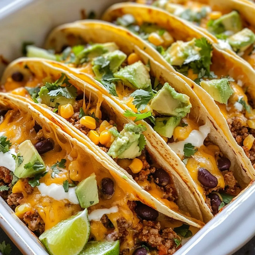 - 12 soft corn tortillas - 1 pound ground beef (or substitutions) - 1 tablespoon taco seasoning - 1 cup black beans, drained and rinsed - 1 cup corn, frozen or canned - 2 cups shredded cheddar cheese - 1 cup salsa - 1 ripe avocado, diced - 1 cup sour cream - Fresh cilantro and lime wedges Gathering the right ingredients is key to making Oven Baked Cheesy Tacos. First, you need the tortillas. Soft corn tortillas work best for this dish. They hold the filling well and add a nice flavor. Next, you need ground beef. You can swap it out for ground turkey or a plant-based meat if you prefer. The taco seasoning adds great flavor to the meat. Just one tablespoon is all you need. For the filling, black beans add protein and texture. Make sure to drain and rinse them first. Corn, either frozen or canned, adds sweetness and crunch. You will also need two cups of shredded cheddar cheese. This cheese melts beautifully and gives that cheesy goodness we all love. Don’t forget the toppings! Salsa adds a fresh kick. Diced avocado gives creaminess. Sour cream adds richness, and fresh cilantro gives color and flavor. Lime wedges are a must for a zesty squeeze over the top. Now that you have your ingredients, you are ready to create a tasty family dinner! {{ingredient_image_2}} - Preheat the oven to 375°F (190°C). This helps cook the tacos well. - Gather your ingredients. This makes the assembly quick and easy. - In a large skillet, brown 1 pound of ground beef. Use medium heat for about 5-7 minutes. - Stir in 1 tablespoon of taco seasoning, 1 cup of black beans, and 1 cup of corn. Cook for 2-3 minutes until heated. - Lightly spray a 9x13 inch baking dish with cooking spray. This helps keep the tacos from sticking. - Lay 12 soft corn tortillas on the bottom of the dish. Overlap them slightly for a strong base. - Spoon the meat mixture over the tortillas. Drizzle 1 cup of salsa on top for flavor. - Sprinkle half of the 2 cups of shredded cheddar cheese over the meat. - Add more tortillas for a second layer. Repeat the meat, salsa, and cheese layers. End with a final layer of tortillas and the rest of the cheese. - Cover the dish with aluminum foil. Bake for 25 minutes. This keeps the tacos moist. - Remove the foil and bake for an extra 10-15 minutes. Look for bubbly, golden cheese. - Once finished, let the dish cool for about 5 minutes. Top with diced avocado and chopped cilantro for color. - Serve hot with sour cream and lime wedges for extra flavor. - Choosing the right cheese: For the best melt, I recommend using sharp cheddar cheese. Its rich flavor pairs well with the beef and spices. You can also mix in Monterey Jack for an extra creamy texture. - Techniques for even melting: Layer your cheese evenly. When you sprinkle it over the tacos, make sure to cover every bit of filling. This helps every bite be cheesy and delicious. Baking covered at first keeps the moisture in, making the cheese melt flawlessly. - Adding extra spices or ingredients: You can boost flavor by adding diced jalapeños or chopped onions to the meat mixture. A dash of cumin or smoked paprika adds depth too. If you love heat, consider a spicier salsa. - Suggested side dishes for pairing: Serve these tacos with a fresh salad or Mexican rice. A side of refried beans is also a great choice. They balance the meal and add more texture. - Presentation tips for serving: I like to serve the tacos right from the baking dish. It looks rustic and welcoming. For a fancier touch, plate individual portions. Add a sprinkle of cilantro and lime wedges for a pop of color. - Ideal accompaniments: Offer sour cream and guacamole on the side. These creamy toppings cut through the spices and add richness. Don't forget to have some lime wedges ready for squeezing. Pro Tips Use fresh tortillas: Fresh corn tortillas will provide a softer texture and better flavor compared to stale ones. Consider warming them slightly before layering for an even better result. Layer with care: Make sure to spread the fillings evenly to prevent any areas from being overstuffed or dry. This will ensure that every bite is delicious! Customize your toppings: Feel free to add other toppings such as jalapeños, diced tomatoes, or olives to the layers for added flavor and texture. Let it rest: Allowing the dish to rest for a few minutes after baking will help the layers set and make serving easier. {{image_4}} You can easily switch ground beef for ground turkey or plant-based meat. Both options taste great. They keep the tacos light and healthy. If you need gluten-free tacos, use corn tortillas. For dairy-free needs, try vegan cheese instead of cheddar. These swaps keep the recipe friendly for different diets. Salsa is key to taco flavor. You can choose mild, medium, or hot salsa. Each adds a unique taste. Want more kick? Try adding jalapeños! You can also customize toppings. Think about adding diced onions, black olives, or fresh tomatoes. Each topping makes the tacos special. You can cook these tasty tacos in a slow cooker or an instant pot. For a slow cooker, layer the tortillas and fillings like in the oven. Cook on low for about 4 hours. For an instant pot, use the sauté function to cook the meat first. Then, layer everything into the pot. Set it to cook on high pressure for 10 minutes. Both methods give you delicious, cheesy tacos with less effort. To keep your oven baked cheesy tacos fresh, store leftovers in an airtight container. This helps prevent moisture loss and keeps the flavors intact. Place the tacos in the fridge within two hours of cooking. They stay good for about three to four days. If you notice any strange smells or colors, it's best to toss them out. You can freeze these tacos either before or after baking. If you freeze them before baking, assemble the tacos in a dish, cover tightly with foil, and freeze. To bake later, let them thaw in the fridge overnight before cooking. If you bake first, let them cool completely, then wrap them well. They can last up
