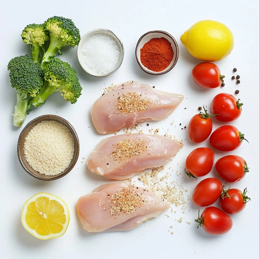 Place the coated chicken breasts in the center of the prepared sheet pan. Arrange the halved cherry tomatoes and broccoli florets around the chicken. Drizzle the vegetables lightly with olive oil, and season them with additional salt, pepper, and a sprinkle of lemon zest.