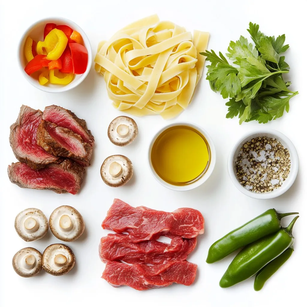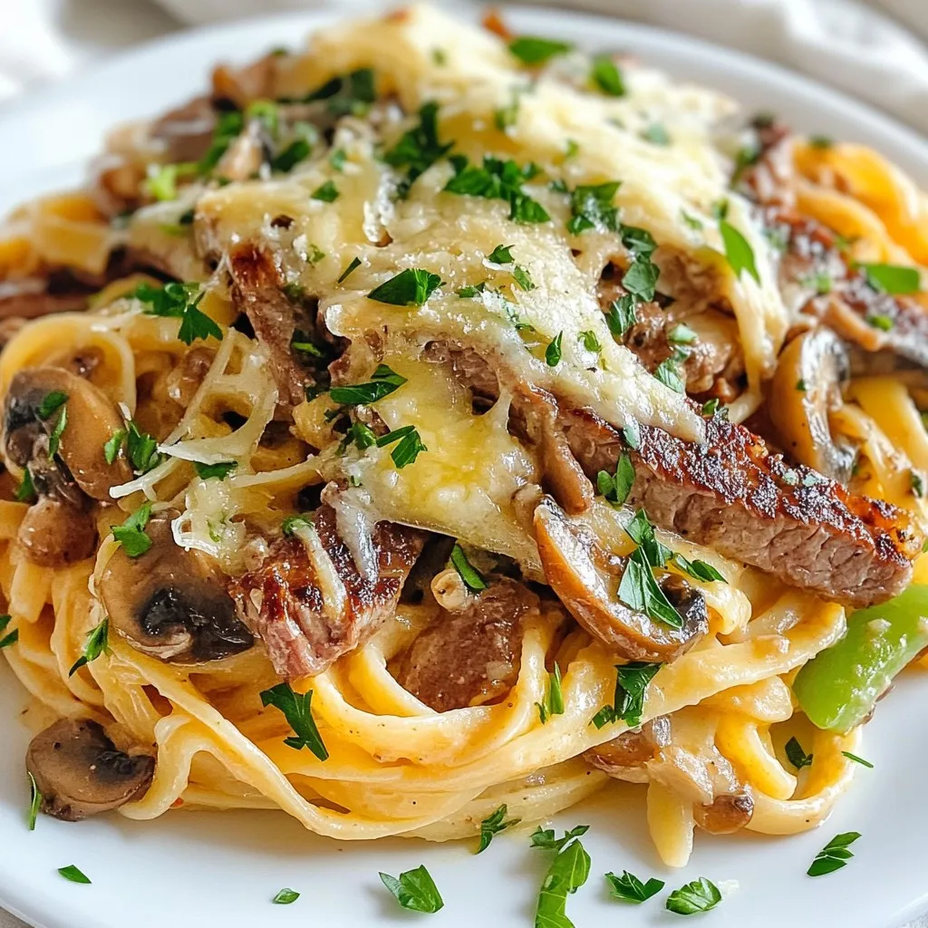 A creamy and savory pasta dish inspired by the classic Philly cheesesteak, featuring ribeye steak, sautéed vegetables, and provolone cheese.