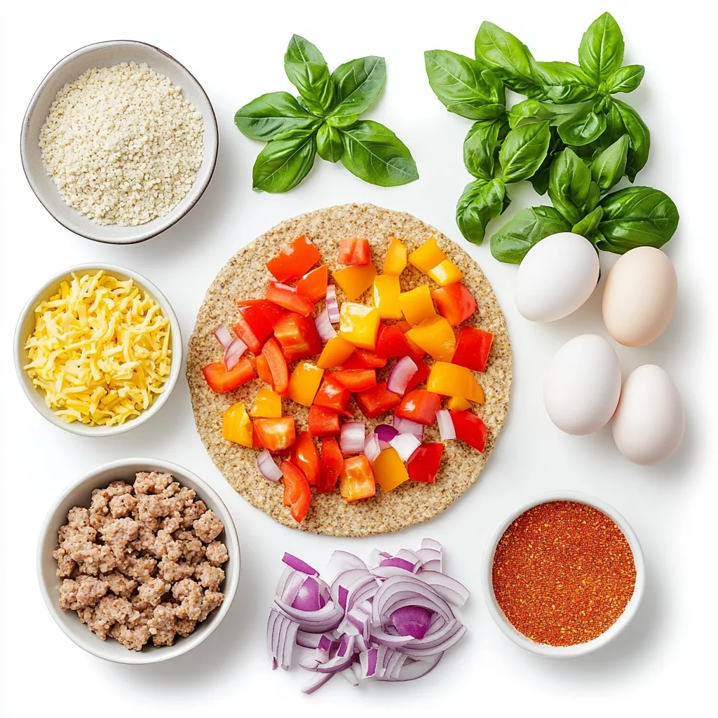 To make your Protein Sausage and Egg Breakfast Pizza, gather your ingredients first. You will need a whole wheat pizza crust, low-fat mozzarella cheese, eggs, turkey sausage, bell peppers, red onion, olive oil, and seasonings. This pizza comes together quickly, so have everything prepped and ready.