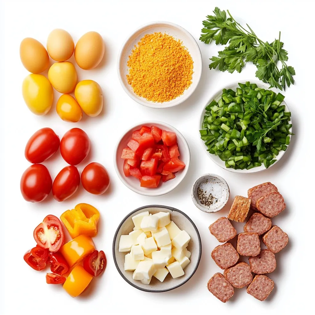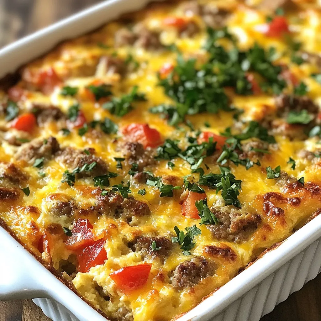- 1 pound breakfast sausage - 6 large eggs - 2 cups whole milk - 1 teaspoon garlic powder - 1 teaspoon onion powder - 1 teaspoon smoked paprika - 1 teaspoon salt - ½ teaspoon black pepper - 1 cup shredded sharp cheddar cheese - 1 cup diced bell peppers - 1 cup diced tomatoes - 8 slices cubed bread - Fresh parsley {{ingredient_image_2}} - Preheat the oven to 350°F (175°C). - In a skillet, cook 1 pound of breakfast sausage over medium heat. Break it apart as it cooks. Stir it until it is brown and fully cooked, about 6-8 minutes. If there is extra fat, drain it carefully. - In a large bowl, crack 6 large eggs. Pour in 2 cups of whole milk. Whisk them together until smooth. - Add 1 teaspoon of garlic powder, 1 teaspoon of onion powder, 1 teaspoon of smoked paprika, 1 teaspoon of salt, and ½ teaspoon of black pepper. Mix well until all is combined. - To the egg mixture, fold in the cooked sausage, 1 cup of diced bell peppers, 1 cup of diced tomatoes, and 1 cup of shredded sharp cheddar cheese. Use a spatula to ensure everything is mixed well. - Gently incorporate 8 slices of cubed bread into the mixture. Make sure each piece is coated with the egg mix. - Grease a 9x13 inch baking dish with cooking spray or butter to prevent sticking. - Pour the sausage and egg mixture into the dish. Spread it evenly with your spatula. - Bake in the preheated oven for 30-35 minutes. The center should be firm, and the top should be golden brown. - Once done, let the casserole cool for about 5 minutes. Cut it into squares and serve hot. - For a burst of color and flavor, garnish with fresh chopped parsley. To make your casserole fluffy, use fresh bread. Stale bread can make it dense. I recommend using sourdough or whole wheat for great texture. For the best results, cube the bread and let it sit out for a bit. This allows it to dry slightly, which helps absorb the egg mixture without becoming soggy. To avoid soggy bread, do not add too much milk or egg mixture. Make sure each bread piece gets coated, but don’t soak them. If you see the mixture pooling, use a spatula to gently push it back into the egg mix. Adding spices can elevate your dish. Try a pinch of cayenne pepper for heat. You can also add fresh herbs like thyme or basil for more depth. If you want a real kick, drizzle hot sauce or sriracha over the top before serving. This adds a nice contrast to the creamy egg and sausage layers. Use a 9x13 inch baking dish for even cooking. This size ensures your casserole bakes through perfectly. A glass dish helps you monitor browning. If you prefer, a metal pan can give you a nice crisp edge. A good spatula is key for mixing. I suggest using a silicone spatula. It won’t scratch your bakeware, and it’s great for folding in the ingredients without breaking them apart. Pro Tips Choose Quality Sausage: Select a breakfast sausage that you enjoy, as its flavor will dominate the dish. Look for varieties that are seasoned well for a tastier bake. Veggie Variations: Feel free to mix in other vegetables such as spinach, mushrooms, or zucchini to enhance the nutritional value and add flavor. Cheese Options: Experiment with different types of cheese, like pepper jack for a spicy twist or feta for a Mediterranean flair. Make Ahead: Prepare the mixture the night before and refrigerate it, so you can simply bake it in the morning for a quick and satisfying breakfast. {{image_4}} You can easily change the sausage in this recipe. Try using turkey sausage or a vegetarian option. Both can add unique flavors. For cheese, switch to mozzarella or pepper jack. These cheeses melt well and give a tasty twist. If you want to cut fat, use low-fat milk instead of whole milk. This small change makes a big difference. For bread, look for gluten-free options if needed. You can still enjoy this dish without gluten. Adding seasonal vegetables can make this casserole even better. Spinach or zucchini are great choices. They add color and nutrients. For a holiday twist, think about using pumpkin spice. It brings warmth and a special flavor to your breakfast. To store leftovers in the fridge, let the casserole cool first. Once it cools, slice it into squares. Place the squares in an airtight container. Use a container that fits the size of your leftovers. This keeps them fresh and tasty. You can store leftovers for up to four days in the fridge. To freeze the casserole, let it cool completely. Then, wrap individual squares in plastic wrap. Place them in a freezer-safe bag or container. Be sure to label the bag with the date. You can freeze it for up to three months. When you are ready to eat, thaw it in the fridge overnight. Reheat in the oven or microwave. To keep the taste great, cover it while reheating. For the best taste, reheat one square at a time. Put it on a plate and cover it with a damp paper towel. Microwave it for about one minute. Check if it’s warm all the way through. If not, heat for another 15 seconds. Leftovers last up to four days in the fridge. Enjoy your tasty breakfast any day! Yes, you can prep this casserole the night before. Cook the sausage and mix the egg mixture as usual. Then, combine all the ingredients in the baking dish and cover it. Place it in the fridge overnight. In the morning, just bake it straight from the fridge. This saves you time and makes breakfast easy. You’ll know the casserole is done when the center is firm. The top should be golden brown, and a toothpick should come out clean when you poke it. This usually takes about 30-35 minutes in the oven. Keep an eye on it to avoid overcooking. Absolutely! You can use any bread you like. Sourdough, whole wheat, or even gluten-free bread works well. Just make sure to cube it into small pieces. This helps it soak up all the tasty egg mixture. Yes, you can change the spice levels to suit your taste. If you like it spicier, add some hot sauce or extra black pepper. If you prefer a milder flavor, reduce the spices or omit them. Cooking is all about wha