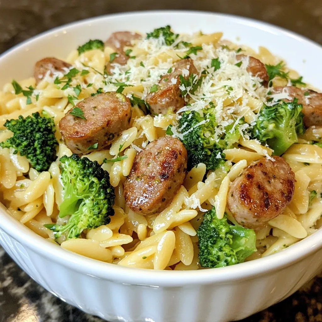 - 1 cup orzo pasta - 2 tablespoons olive oil - 2 chicken sausages, sliced into rounds - 2 cups broccoli florets, fresh - 2 cloves garlic, finely minced - 1 teaspoon Italian seasoning blend - 1 cup low-sodium chicken broth - 1/2 cup grated Parmesan cheese - Salt and freshly ground black pepper to taste - Fresh parsley, chopped (for garnish) When making Chicken Sausage Broccoli Orzo, the ingredients are simple yet full of flavor. You start with orzo pasta, which is small and cooks quickly. Olive oil adds richness and helps to sauté the sausage. Speaking of sausage, I like using chicken sausage for a lighter touch, but feel free to use your favorite type. Fresh broccoli gives a nice crunch, and it’s packed with nutrients. For flavor, you’ll need garlic, which brings warmth and aroma. Italian seasoning adds a blend of herbs that enhances the dish. Low-sodium chicken broth keeps it flavorful without being too salty. Parmesan cheese melts in to create a creamy texture, making every bite delicious. Don’t forget a pinch of salt and pepper to taste! Finally, a sprinkle of fresh parsley brightens up the dish and adds color. This mix of ingredients comes together to create a balanced and tasty meal. {{ingredient_image_2}} 1. Start by boiling a medium pot of salted water. 2. Once the water is bubbling, add 1 cup of orzo pasta. 3. Cook the orzo until it is al dente, usually about 8-10 minutes. 4. Drain the orzo in a colander and set it aside. 1. Heat 2 tablespoons of olive oil in a large skillet over medium heat. 2. Add 2 sliced chicken sausages to the skillet. 3. Sauté the sausage slices for about 4-5 minutes until they turn golden brown. 1. Mince 2 cloves of garlic and add them to the skillet. 2. Sauté the garlic for about 1 minute until it smells nice. 3. Toss in 2 cups of fresh broccoli florets. 4. Cook the broccoli for about 3-4 minutes until it is tender-crisp. 5. Sprinkle 1 teaspoon of Italian seasoning on top. 6. Pour in 1 cup of low-sodium chicken broth and bring it to a gentle simmer. 1. Stir in the cooked orzo and heat everything for a few minutes. 2. Remove the skillet from heat and fold in 1/2 cup of grated Parmesan cheese. 3. Mix until the cheese melts and blends into the dish. 4. Taste, then add salt and freshly ground black pepper as needed. 5. Serve hot, garnished with freshly chopped parsley. - Ensuring the orzo is perfectly al dente: Start with a large pot of salted water. When it boils, add the orzo. Check the package for cooking time and taste it a minute early. You want it firm yet tender, not mushy. - Preventing the garlic from burning: Add garlic to the skillet after the sausage is golden. Stir it for just a minute until it smells great. Keep the heat on medium to avoid burning. - Cooking broccoli for the right texture: Add fresh broccoli florets to the skillet after the garlic. Stir them for 3 to 4 minutes. Look for a bright green color and a tender-crisp feel. This keeps the broccoli fresh and flavorful. - Presentation tips for an appealing dish: Serve the orzo in warm bowls. Drizzle a bit of olive oil on top. Add extra cheese shavings for a nice touch. A sprinkle of fresh parsley also brightens up the dish. - Recommended side dishes or salads: Pair this dish with a simple green salad. A side of crusty bread is great for soaking up flavor, too. You can also serve it with roasted vegetables for added color and taste. - Overview of calories and nutrients per serving: This dish has about 400 calories per serving. It offers protein from the chicken sausage and fiber from the broccoli. The orzo adds carbohydrates for energy. - Health benefits of ingredients used: Chicken sausage is lean and packed with protein. Broccoli is full of vitamins C and K. Parmesan cheese adds calcium. Olive oil provides healthy fats. Together, they make a balanced meal! Pro Tips Perfectly Cooked Orzo: Make sure to cook the orzo until al dente to maintain its texture. It will continue to absorb liquid from the sauce, so avoid overcooking it initially. Flavor Boost: Enhance the dish by using homemade chicken broth instead of store-bought for a richer flavor. You can also add a splash of white wine for a delicious depth. Vegetable Variations: Feel free to swap out the broccoli for other vegetables such as spinach, bell peppers, or zucchini, depending on your preference or what's in season. Garnishing Tips: Adding a squeeze of fresh lemon juice just before serving brightens the dish, while extra cheese and herbs provide a beautiful finish. {{image_4}} You can switch up the sausage in this dish. Turkey sausage works well if you want a leaner option. It's just as tasty! You can also try plant-based sausage for a vegetarian twist. For vegetables, broccoli is great, but you can use other greens too. Spinach wilts down nicely, adding a fresh taste. Bell peppers bring a sweet crunch and color to your dish. Feel free to mix and match your favorites! Adding spices can change the whole flavor profile. A pinch of red pepper flakes gives it a nice kick. For a herby touch, try adding fresh basil or oregano. Both pair well with the chicken sausage and orzo. If you want a richer dish, a splash of cream works wonders. It makes the sauce creamy and smooth. Just stir it in just before serving for added luxury. To keep your Chicken Sausage Broccoli Orzo fresh, use an airtight container. This helps lock in flavor and moisture. Store it in the fridge right after it cools. It will stay fresh for about 3 to 4 days. If you want to keep it longer, consider freezing it. It can last up to 3 months in the freezer. Just make sure to label the container with the date. When you’re ready to eat, you can reheat your leftovers either in the microwave or on the stovetop. For the microwave, place it in a bowl and cover it. Heat it in short bursts, stirring in between. This keeps the orzo from drying out. If you prefer the stovetop, add a splash of chicken broth in a skillet. Heat it over low, stirring often. This method keeps it c