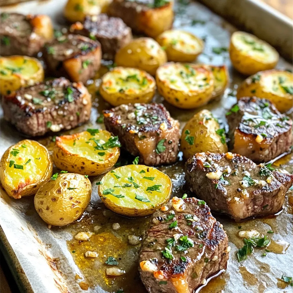 2. Resting and garnishing before serving: Before you serve, sprinkle chopped fresh parsley on top. This adds color and freshness. You can serve it right on the sheet pan or on a platter for a nice presentation. Enjoy your savory sheet pan garlic butter steak bites and potatoes!