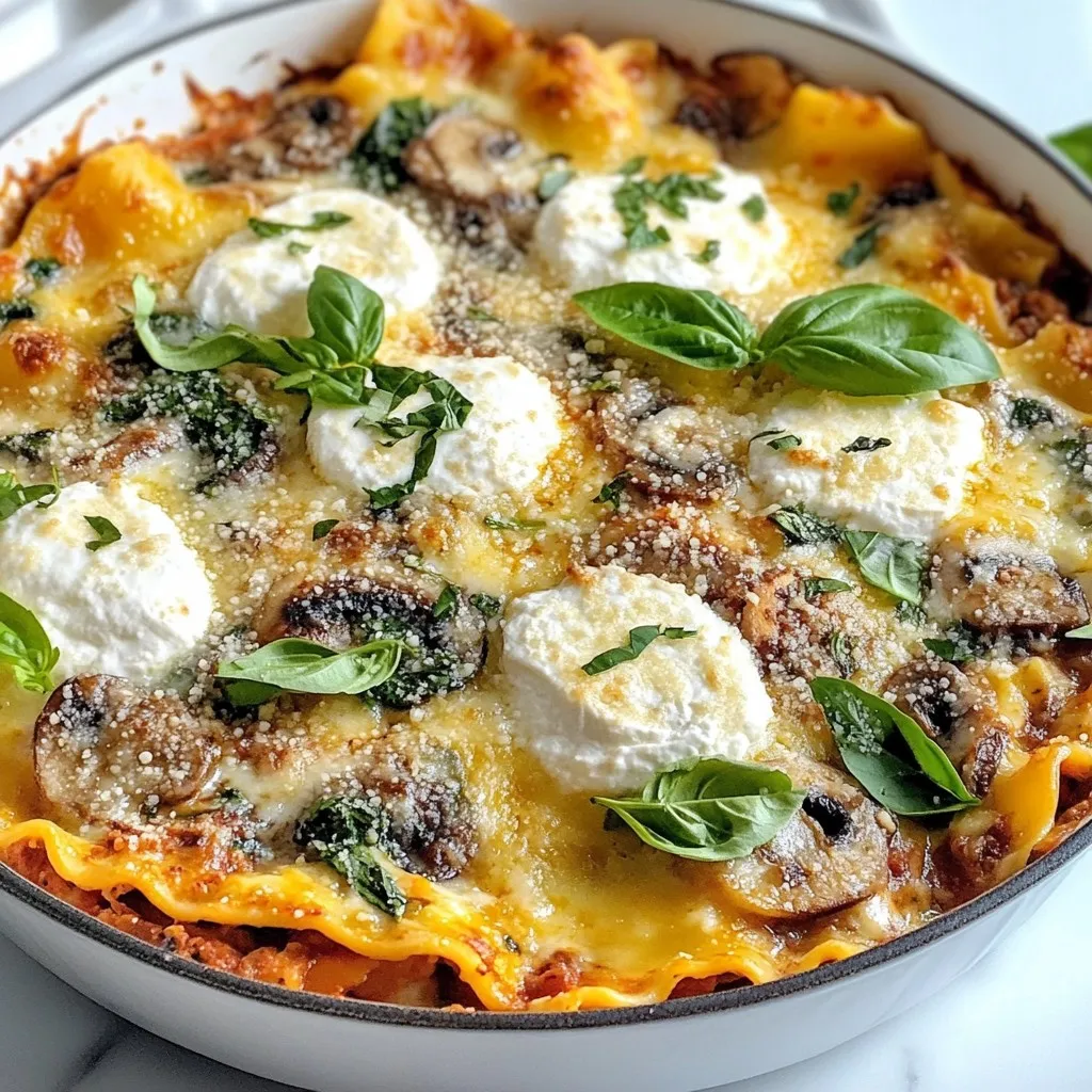 A delicious one-pan lasagna featuring spinach, mushrooms, and creamy ricotta, perfect for a cozy meal.