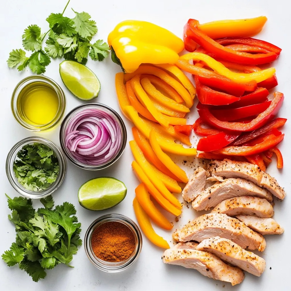To make delicious sheet pan chicken fajitas, you'll need the following ingredients: - Chicken: 1 lb boneless, skinless chicken breasts, sliced into thin strips - Vegetables: 2 red bell peppers, sliced into thin strips, 2 yellow bell peppers, sliced into thin strips, 1 medium red onion, thinly sliced - Seasonings: 2 tablespoons fajita seasoning, 1 teaspoon garlic powder, 1 teaspoon ground cumin - Additional Ingredients: 3 tablespoons olive oil, salt and freshly ground black pepper to taste, fresh cilantro, roughly chopped (for garnish), lime wedges (for serving), tortillas (flour or corn, for serving) These ingredients work together to create a colorful and tasty meal. The chicken brings protein, while the bell peppers and onion add crunch and sweetness. The seasonings give a warm, spicy kick. Olive oil keeps everything moist and helps with cooking. Finally, cilantro and lime juice add freshness and brightness. Using these simple ingredients makes it easy to enjoy a flavorful dinner. You can find most of these items at your local grocery store. If you want to save time, pre-sliced chicken and pre-cut veggies can work just as well. {{ingredient_image_2}} Start by setting your oven to 400°F (200°C). This high heat cooks the chicken and veggies evenly. A hot oven helps to get that nice char on the edges. Slice the chicken into thin strips. This helps it cook fast. For the peppers and onion, aim for thin slices too. Thin pieces cook more evenly and soak up the flavors better. Drizzle 3 tablespoons of olive oil over the chicken and veggies. Then, sprinkle 2 tablespoons of fajita seasoning, 1 teaspoon of garlic powder, and 1 teaspoon of ground cumin. Add salt and pepper to taste. Mix everything well so every piece is coated. Transfer the mixture to a large baking sheet. Spread the chicken and veggies in a single layer. This is key for even cooking. If they’re piled up, they’ll steam instead of roast. Place the sheet pan in the preheated oven. Bake for about 25 to 30 minutes. Stir the mixture halfway through. This helps ensure the chicken is fully cooked and the veggies are tender. After baking, take the pan out and let it sit for a few minutes. This resting time allows the flavors to settle. It also keeps the chicken juicy. To serve, spoon the warm fajita mix into tortillas. Top with fresh cilantro for a burst of flavor. Don't forget lime wedges on the side. A squeeze of lime adds a zesty kick that makes these fajitas shine! For this recipe, I recommend using boneless, skinless chicken breasts. They cook quickly and stay juicy. If you prefer, chicken thighs offer more flavor and tenderness. Just cut them into strips like the breasts. Always choose fresh chicken for the best taste. You can easily make fajita seasoning at home. Mix these spices in a bowl: - 1 tablespoon chili powder - 1 teaspoon garlic powder - 1 teaspoon onion powder - 1 teaspoon ground cumin - 1 teaspoon smoked paprika - Salt and pepper to taste This blend will give your chicken and veggies a great kick. Adjust the spice levels to fit your taste. Space is key when using a sheet pan. Always spread the chicken and veggies out in a single layer. If they’re too crowded, they will steam instead of roast. Stir the mixture halfway through cooking to help everything cook evenly. This way, you’ll have tender chicken and crisp veggies. Pro Tips Use Fresh Ingredients: Fresh chicken and vibrant vegetables make a significant difference in flavor and texture. Always opt for the freshest produce available. Customize Your Seasoning: Feel free to adjust the fajita seasoning to your taste. Add more spice or include additional herbs for a unique twist! Don’t Overcrowd the Pan: Spreading the chicken and vegetables in a single layer allows them to roast properly and develop a nice caramelization. Experiment with Toppings: Aside from cilantro and lime, consider adding avocado, salsa, or sour cream to enhance your fajitas with extra flavor and creaminess. {{image_4}} You can swap chicken for plant-based options. Use sliced tofu or tempeh. These options soak up flavors well. Add more veggies like zucchini or mushrooms for extra taste. Bell peppers and onions still work great. Remember to use a vegan fajita seasoning. This keeps your dish plant-based and full of flavor. Want to kick up the heat? Add jalapeños or chili powder. Slice fresh jalapeños and mix them in with the chicken and veggies. If you prefer chili powder, sprinkle it in the seasoning mix. Start with a little and taste as you go. This way, you control the spice level in your fajitas. Try serving the fajita mixture over rice or salad. Cooked rice makes a hearty base. Use brown rice for a healthy option. If you want something lighter, a fresh salad works too. Top it with the fajita mix and add avocado or cheese. This gives you a fun twist on the classic fajita. To store fajitas, let them cool first. Place them in an airtight container. This keeps them fresh. Store them in the fridge. They last up to three days. If you have tortillas, store them separately. This prevents them from getting soggy. To reheat, use the oven for best results. Preheat it to 350°F (175°C). Spread the fajitas on a baking sheet. Cover them with foil to keep moisture. Heat for about 10-15 minutes. This keeps the chicken and veggies tender. You can also use a microwave. Place fajitas in a bowl and cover it. Heat in short bursts, stirring in between. You can freeze fajitas for longer storage. Let them cool completely first. Use freezer-safe bags or containers. Remove as much air as possible. Label with the date. They can last up to three months. When ready to eat, thaw in the fridge overnight. Reheat as mentioned above. This way, your fajitas taste fresh! Yes, you can use other proteins for this dish. Try beef strips for a heartier option. Shrimp also works well and cooks quickly. For a lighter choice, use turkey breast. If you want a plant-based version, consider using tofu or tempeh. Each choice gives a