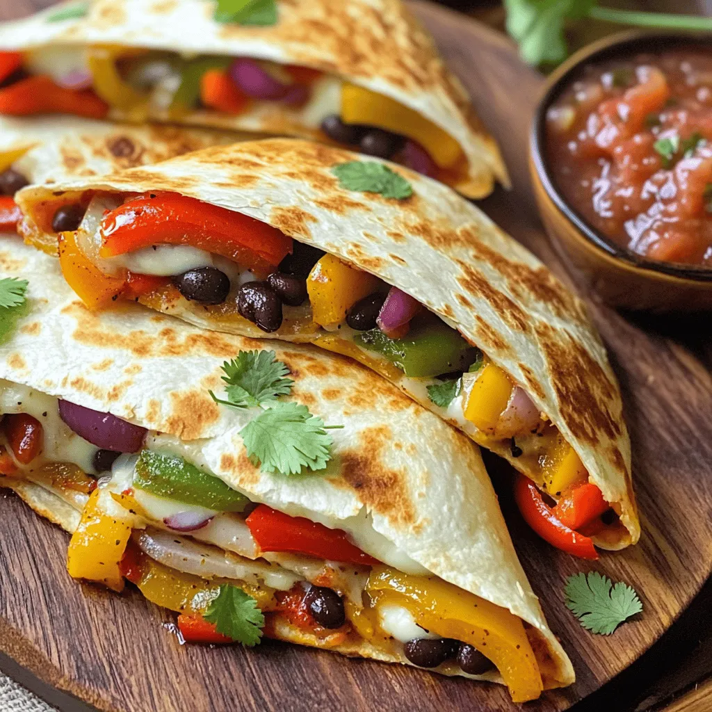 - Fresh Vegetables Required - 1 red bell pepper, sliced into thin strips - 1 yellow bell pepper, sliced into thin strips - 1 green bell pepper, sliced into thin strips - 1 medium red onion, sliced into thin strips - Seasoning and Oils - 2 tablespoons extra virgin olive oil - 1 teaspoon chili powder - 1 teaspoon ground cumin - 1/2 teaspoon garlic powder - Salt and black pepper to taste - Other Essential Ingredients - 8 whole wheat tortillas - 2 cups shredded mozzarella cheese (or cheese of your choice) - 1 cup canned black beans, rinsed and drained - Fresh cilantro leaves for garnish These ingredients create a colorful medley that packs the quesadillas with flavor. The fresh vegetables bring crunch and sweetness, while the spices add warmth. Whole wheat tortillas hold everything together, making this dish both healthy and hearty. Shredded cheese melts beautifully, providing the gooey texture we all love. Finally, black beans boost protein, making this meal satisfying. Remember, you can always adjust the veggies and spices based on what you like! Preheating the Oven Start by setting your oven to 400°F (200°C). This heat helps roast the veggies and makes them sweet. Roasting the Vegetables On a large baking sheet, spread out the sliced bell peppers and red onion. - Use: - 1 red bell pepper - 1 yellow bell pepper - 1 green bell pepper - 1 medium red onion - Drizzle 2 tablespoons of extra virgin olive oil over the veggies. - Sprinkle with: - 1 teaspoon chili powder - 1 teaspoon ground cumin - 1/2 teaspoon garlic powder - Salt and black pepper to taste - Toss everything well to coat. Roast in the oven for 20 minutes. Stir halfway to get even cooking. Assembling the Quesadillas After roasting, let the veggies cool for about 5 minutes. On a clean surface, lay out four tortillas. - Add the roasted veggies, 1 cup of rinsed black beans, and 2 cups of shredded mozzarella cheese to each tortilla. - Place the other four tortillas on top. Press gently to hold the filling inside. Final Baking Process Put the assembled quesadillas back on the baking sheet. Bake for 10-12 minutes. The tortillas should turn golden and crispy, and the cheese will melt. After baking, take them out and let them cool for a few minutes before slicing. Achieving the Right Crispy Texture To get that perfect crispy texture, use whole wheat tortillas. They hold up well and add a nice bite. Make sure to bake them at 400°F (200°C). This high heat helps crisp the tortillas without burning. After baking, let them cool for a few minutes before slicing. This cooling time helps keep them crispy. Choosing the Best Cheese Mozzarella cheese is a great choice because it melts beautifully. You can also try cheddar or pepper jack for a bolder taste. Mixing cheeses can add a fun twist. Just remember to shred the cheese for even melting. A good rule is to use about 1/2 cup of cheese per quesadilla. Flavor Enhancements and Pairings You can boost the flavor of your quesadillas with fresh herbs. Cilantro works well, but you can also try basil or parsley. Adding a squeeze of lime juice brightens the dish. Serve with salsa or creamy guacamole for dipping. These pairings enhance the taste and make your meal even more enjoyable. {{image_4}} You can use different cheeses in this recipe. Try sharp cheddar or pepper jack for a kick. Vegan cheese works well too. Just choose what you love best. Want to make it heartier? Add proteins like chicken, beef, or shrimp. Cook them separately before adding to the quesadillas. Canned beans like pinto or kidney are also great for added protein. Feel free to mix in your favorite veggies. Zucchini, mushrooms, or corn add great flavor. You can also try different spices. Paprika or taco seasoning gives a nice twist. Get creative and make it your own! Best Practices for Refrigeration After you enjoy your sheet pan fajita veggie quesadillas, let them cool. Wrap each quesadilla in plastic wrap or foil. Place them in an airtight container. Store in the fridge for up to three days. This keeps the flavors fresh and the texture nice. Freezing Instructions To freeze your leftovers, wrap the quesadillas tightly in plastic wrap. Then, place them in a freezer-safe bag or container. Make sure to remove as much air as possible. You can freeze them for up to three months. When you're ready to enjoy them, just thaw in the fridge overnight. Reheating Tips for Optimal Taste and Texture To reheat, use an oven or a skillet for the best results. Preheat your oven to 350°F (175°C). Place the quesadillas on a baking sheet. Heat them for about 10-15 minutes, or until warm. If using a skillet, heat it over medium heat. Cook each quesadilla for about 3-4 minutes on each side, until crispy and hot. Enjoy every bite just like when they were fresh! Yes, you can make these quesadillas ahead of time. Prepare the roasted veggies and fill the tortillas. Store them in the fridge for up to 24 hours. When ready, bake them. This saves time for busy days. Whole wheat tortillas work best in this recipe. They hold up well and add a nutty flavor. You can also use corn tortillas for a gluten-free option. Just ensure they are sturdy enough to hold the fillings. To customize spice, adjust the chili powder in the recipe. Use less for a milder taste or add more for heat. You can also add sliced jalapeños or a dash of hot sauce. This way, you control the flavor to suit your taste. In this post, we explored how to make great quesadillas. We covered fresh vegetables, seasonings, and essential ingredients. You learned step-by-step instructions from prep to baking. I shared tips for the perfect crispy texture and tasty pairings. We also discussed variations with different cheeses and proteins. Finally, I provided storage tips to keep your quesadillas fresh. Enjoy experimenting with your quesadillas for fun meals ahead!