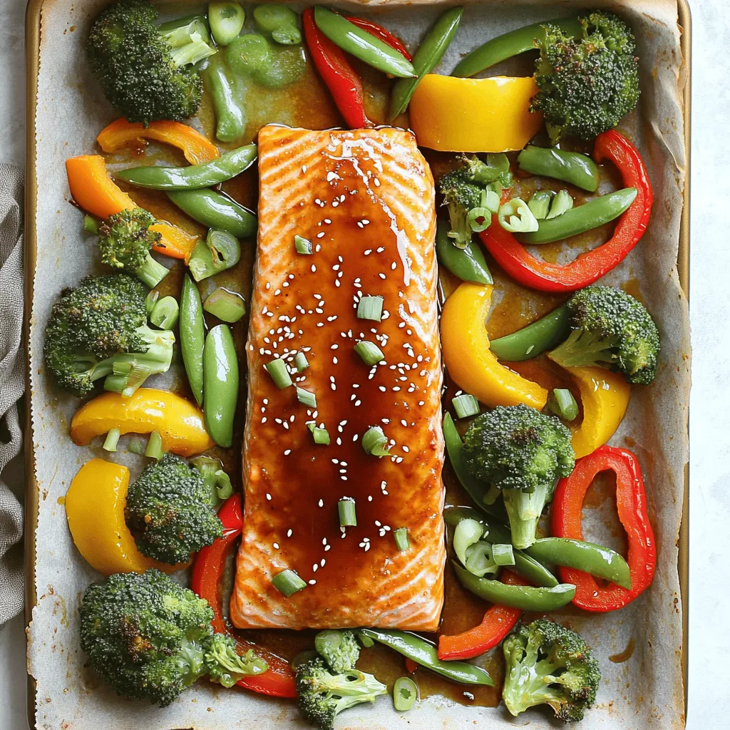 For this dish, I love using fresh salmon fillets. They cook perfectly on a sheet pan. The broccoli, bell peppers, and snap peas bring color and texture. They also add great nutrition. The teriyaki sauce gives a sweet and savory flavor. Fresh ginger and garlic make it even better.