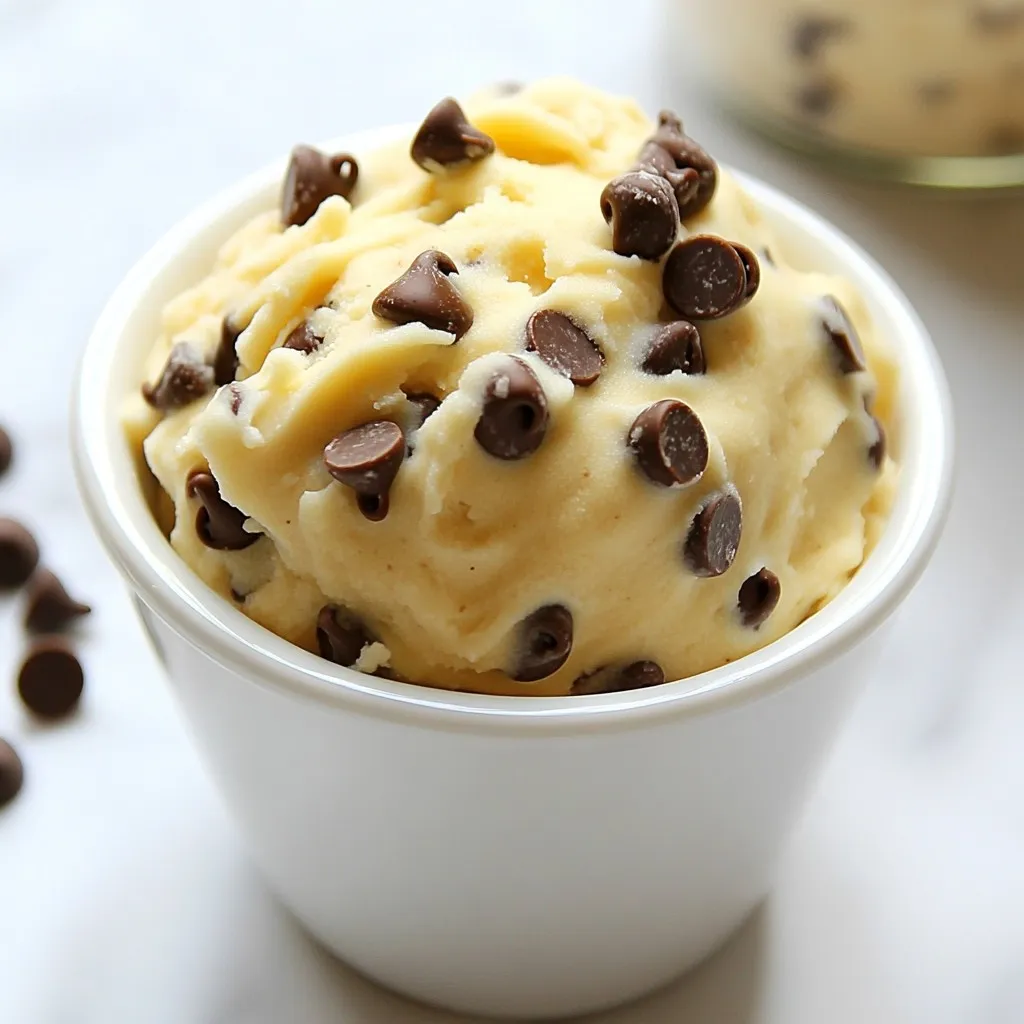 To make your single-serve edible cookie dough, gather these ingredients: - 3 tablespoons all-purpose flour - 1 tablespoon unsalted butter, softened to room temperature - 1 tablespoon packed brown sugar - 1 tablespoon granulated sugar - 1/4 teaspoon pure vanilla extract - 1 tablespoon milk (dairy or plant-based) - 2 tablespoons mini chocolate chips - A pinch of fine sea salt These simple items make a rich cookie dough that you can enjoy right away. You can swap ingredients to fit your taste or needs: - All-purpose flour can be replaced with oat flour for a gluten-free option. - Use coconut oil in place of unsalted butter for a dairy-free version. - If you’re out of brown sugar, regular granulated sugar works too. - For milk, any plant-based milk like almond or soy can be used. These swaps keep your cookie dough tasty and enjoyable. Want to customize your cookie dough? Here are some fun add-ins to try: - Chopped nuts for a crunchy texture. - Sprinkles for a colorful touch. - Peanut butter or almond butter for a nutty flavor. - Dried fruit for added sweetness. Experiment with these options to create your perfect treat! {{ingredient_image_2}} To make single-serve edible cookie dough, start by gathering your ingredients. You need: - 3 tablespoons all-purpose flour - 1 tablespoon unsalted butter, softened - 1 tablespoon packed brown sugar - 1 tablespoon granulated sugar - 1/4 teaspoon pure vanilla extract - 1 tablespoon milk (dairy or plant-based) - 2 tablespoons mini chocolate chips - A pinch of fine sea salt First, take a small mixing bowl. Add the softened butter, packed brown sugar, and granulated sugar. Mix these together with a fork or a hand mixer. Aim for a creamy and light texture. This takes just a minute or two. Next, stir in the pure vanilla extract and milk. Mix until it is smooth and well-combined. In another bowl, sift the all-purpose flour and fine sea salt. This step helps break up any lumps. Slowly fold this flour mixture into your wet mix. Keep stirring until you form a rich, cohesive dough. When your dough is ready, gently fold in the mini chocolate chips. Ensure they are spread evenly throughout the dough. At this point, taste your cookie dough! If you want a sweeter treat, add a bit more granulated sugar. Mix it in and taste again if needed. For a fun presentation, scoop the cookie dough into a small bowl or a cute jar. Top it with a few extra mini chocolate chips. This makes it look even more inviting. You can also serve the cookie dough with fresh fruit slices, like strawberries or apples. This adds a nice crunch and freshness to each bite. Enjoy your single-serve edible cookie dough right away for the best experience! To get the best texture, use room temperature butter. This helps blend well with sugars. Mix until creamy for a smooth dough. If your dough is too dry, add a bit more milk. If it’s too wet, add a sprinkle of flour. The goal is a soft, not sticky dough. Taste your cookie dough before serving. If you want it sweeter, add more sugar. Start with just a little at a time. Mix well after each addition to avoid overpowering the flavor. You can use brown sugar for a richer taste or keep it simple with granulated sugar. Watch out for these common errors: - Using cold butter: This makes mixing hard. Always use softened butter for a smooth blend. - Skipping the salt: A tiny pinch enhances flavor. Don't skip it! - Overmixing the dough: This can make it tough. Mix just until combined. By following these tips, you’ll create a delightful single-serve edible cookie dough that’s perfect every time! Pro Tips Use Heat-Treated Flour: To make your cookie dough safe to eat, consider using heat-treated flour. Spread it on a baking sheet and bake at 350°F (175°C) for about 5 minutes to kill any bacteria. Experiment with Flavors: Feel free to customize your cookie dough by adding different extracts like almond or coconut for a unique twist. Mix-Ins Galore: Get creative with your mix-ins! Try adding nuts, dried fruit, or even crushed cookies to enhance the texture and flavor. Chill for Extra Firmness: If you prefer a firmer dough, chill your cookie dough in the refrigerator for about 15 minutes before serving. {{image_4}} You can change the taste of your edible cookie dough easily. For a nutty twist, try adding one tablespoon of your favorite nut butter. Almond or peanut butter works great. This adds creaminess and flavor. If you want a fun and colorful treat, add a tablespoon of funfetti sprinkles. They make your cookie dough look festive and exciting. You can also use flavored extracts like almond or hazelnut for a unique taste. The options are endless! You can modify this recipe to fit your diet. To make it vegan, swap the butter for coconut oil or a plant-based butter. Use a plant-based milk, like almond or oat milk, to keep it dairy-free. For gluten-free cookie dough, replace all-purpose flour with almond flour or gluten-free flour blend. This way, everyone can enjoy this tasty treat without worry. Get creative with your mix-ins! You can add chopped nuts, dried fruit, or even crushed cookies for extra texture. Try mini marshmallows for a s'mores vibe, or add a tablespoon of cocoa powder for a chocolate version. Feel free to experiment and find your favorite combinations. The best part is that you can make it just the way you like! If you have leftover cookie dough, store it in an airtight container. This keeps it fresh and tasty. Place the container in the fridge. Your cookie dough will stay good for about three days. If you want to enjoy it later, freezing is a better option. To freeze your cookie dough, scoop it into small portions. You can use a cookie scoop or spoon. Place the scoops on a baking sheet lined with parchment paper. Freeze them for about an hour until they are solid. Once frozen, transfer the scoops to a freezer-safe bag. This way, you can grab one when a craving hits! When stored correctly, cookie dough lasts well in the fridge or freezer. In the fr