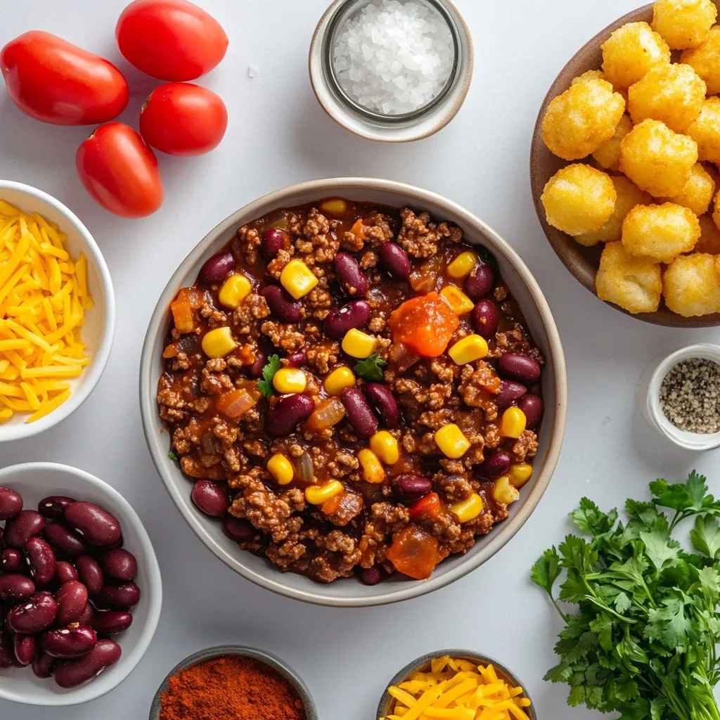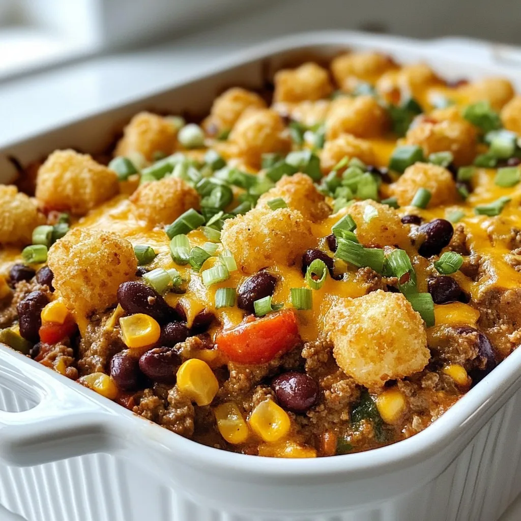 A hearty and flavorful casserole made with ground beef, beans, corn, and topped with crispy tater tots and melted cheddar cheese.