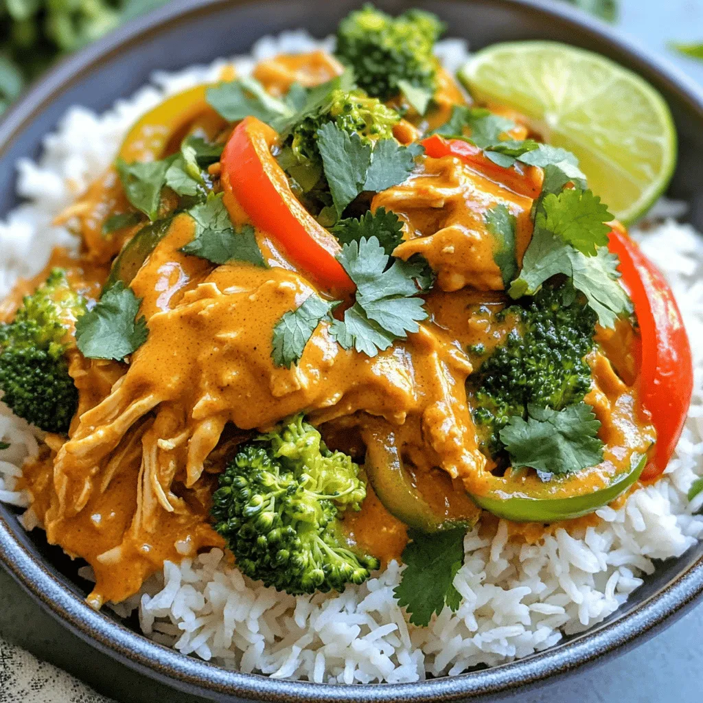 - 2 pounds boneless, skinless chicken thighs - 1 cup full-fat coconut milk - 1/2 cup creamy natural peanut butter - 1/4 cup soy sauce - 2 tablespoons honey or maple syrup - 2 tablespoons red curry paste - 1 tablespoon minced garlic - 1 tablespoon freshly grated ginger - 1 bell pepper, thinly sliced - 1 cup broccoli florets - Salt and freshly ground black pepper - Garnishes: chopped fresh cilantro and lime wedges The main ingredients create a rich sauce. The chicken thighs stay moist and tender. The coconut milk adds creaminess. Peanut butter gives a nutty taste. Soy sauce adds depth to the flavor. Honey or maple syrup adds sweetness. Red curry paste brings heat and spice. Garlic and ginger create a fragrant base. The vegetables add color and crunch. Bell peppers are sweet and crisp. Broccoli adds nutrition and texture. Salt and pepper enhance all the flavors. Garnishes like cilantro and lime add freshness. They brighten the dish and make it appealing. Each component works together for a delightful meal. To start, gather your ingredients. In a medium bowl, mix the coconut milk, peanut butter, soy sauce, honey, red curry paste, minced garlic, and ginger. Use a whisk to blend everything well. This ensures a smooth sauce. It should be creamy and well-mixed. Now, it's time for the slow cooker. Place the chicken thighs at the bottom. Season them with salt and black pepper. Pour the peanut sauce over the chicken. Make sure every piece is coated. Next, layer the sliced bell pepper and broccoli on top. This adds color and crunch to your meal. Cover the slow cooker. Cook on low for 6-8 hours or high for 4-5 hours. The chicken should become tender and easy to shred. After cooking, use two forks to shred the chicken right in the sauce. Stir to mix everything together. Taste the dish and adjust seasoning if needed. If you like more heat, add extra red curry paste for a spicy kick. - Choosing the right chicken cuts I prefer boneless, skinless chicken thighs. They stay juicy and tender. Chicken breasts can dry out too fast. Thighs absorb flavors better. - Importance of seasoning Season your chicken well. Use salt and pepper before adding sauce. This boosts the overall flavor. Don't skip this step, as it makes a big difference. - Adding extra spices Feel free to experiment with spices. A dash of cayenne adds heat. You can also try paprika for a smokier taste. Just remember to start small and taste as you go. - Cooking time adjustments for desired tenderness Cook on low for 6-8 hours for super tender chicken. If short on time, use high for 4-5 hours. The longer you cook, the easier the chicken shreds. - Best sides to pair with Thai Peanut Chicken Serve over jasmine rice or quinoa. Both soak up the sauce well. Steamed veggies are great too. They add color and balance to the meal. - Garnishing for appeal Fresh cilantro brightens the dish. Add a lime wedge for a zesty twist. These little touches make your meal look and taste amazing. {{image_4}} You can easily make this dish gluten-free. Just use tamari instead of soy sauce. Tamari has a similar taste but contains no gluten. This swap keeps the meal delicious while catering to gluten-free diets. Want to switch things up? You can use tofu or shrimp instead of chicken. For tofu, choose firm or extra-firm for the best texture. Cut it into cubes and follow the same steps. For shrimp, add them in the last 30 minutes of cooking to keep them tender. You can adjust the spice levels to fit your taste. If you like it spicy, add more red curry paste. For milder flavor, reduce the paste. You can also add more veggies. Try snap peas, carrots, or mushrooms to enhance the dish. Mixing in different vegetables adds color and nutrition. To store leftovers safely, let the dish cool first. Transfer it to an airtight container. Place it in the fridge within two hours of cooking. This keeps your Thai peanut chicken fresh and delicious. Consume it within three to four days for the best taste. For freezing, use a freezer-safe container. Make sure to leave some space at the top. This lets the dish expand as it freezes. You can freeze it for up to three months. When you're ready to eat, thaw it in the fridge overnight. Reheat it gently on the stove or in the microwave until hot. In the fridge, your Slow Cooker Thai Peanut Chicken lasts about three to four days. If frozen, it keeps well for up to three months. Always check for signs of spoilage before eating. If it looks or smells off, it’s best to toss it. Yes, you can prepare this dish ahead of time. You can mix the sauce and store it in the fridge. You can also slice the vegetables and season the chicken. Just combine everything in the slow cooker before cooking. This makes dinner easy on busy days. If you need a substitute for coconut milk, try using almond milk or soy milk. You can also use a mix of milk and a little peanut butter for creaminess. These options will change the flavor a bit but will still taste good. The spice level depends on the red curry paste you use. Generally, it has a mild to medium heat. If you prefer it spicier, you can add more red curry paste. You can also serve it with chili flakes for extra heat. Yes, you can cook Thai Peanut Chicken on the stovetop. Start by browning the chicken in a pot. Then, add the sauce and vegetables. Let it simmer on low heat for about 30 minutes. This method cooks the chicken faster while keeping it tender. This article explored how to make a delicious Slow Cooker Thai Peanut Chicken. We covered the main ingredients, step-by-step cooking instructions, and useful tips. I shared options for variations and storage advice, so you can enjoy this dish anytime. In summary, this meal is easy to prepare and full of flavor. Try experimenting with different proteins or spice levels. It’s a great way to impress friends and family without much effort. Enjoy cooking!