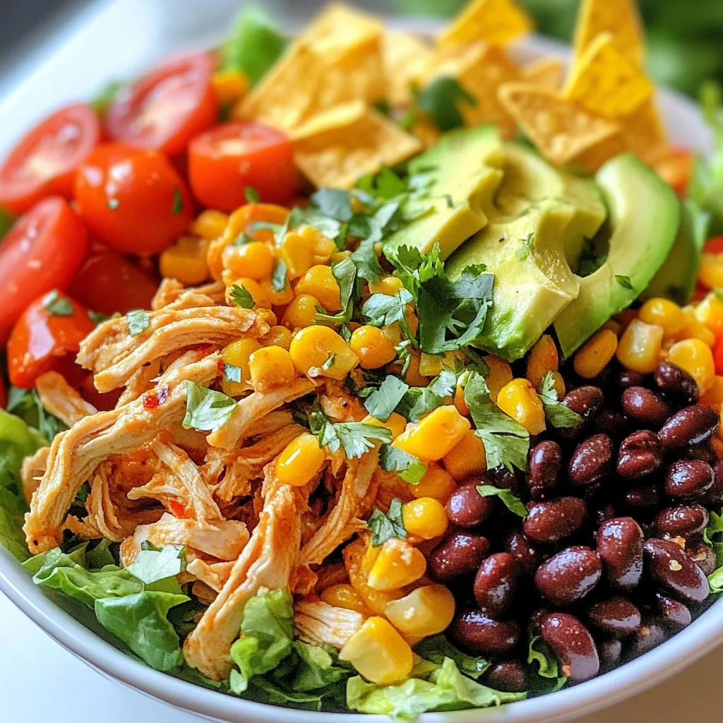 The ingredients in this salad are packed with health benefits. Shredded chicken offers lean protein, which helps build muscle. Black beans add fiber, good for digestion. Corn gives you vitamins and minerals, while bell peppers are rich in antioxidants. Avocado provides healthy fats that are good for your heart. Eating this salad can help with weight control and overall health. For dietary considerations, this dish is great for those looking for gluten-free options.