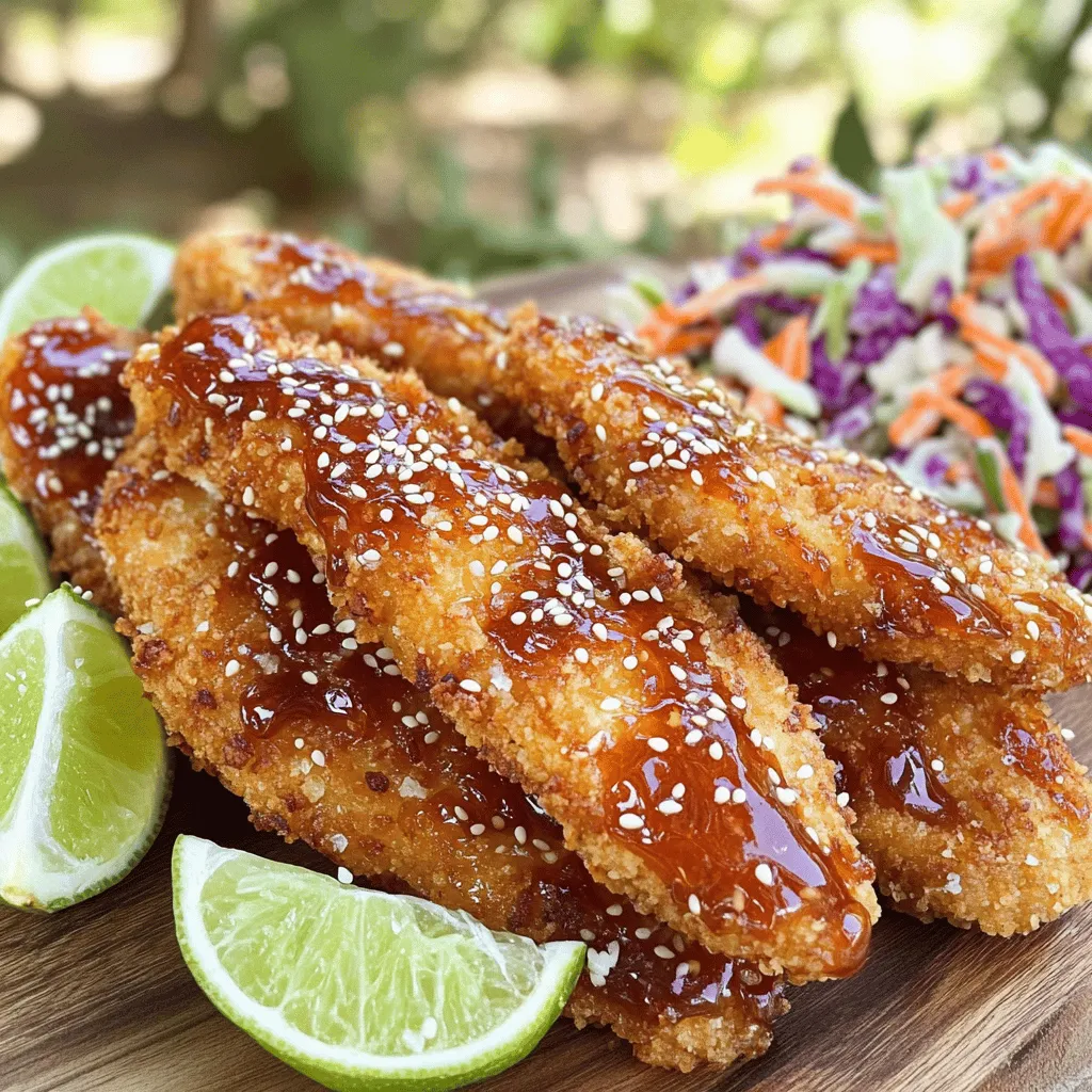 Arrange the chicken tenders on a serving platter. Drizzle the reserved sauce on top for added flavor. For a colorful presentation, serve with fresh lime wedges and a sprinkle of sesame seeds. You might also pair them with crispy coleslaw for a refreshing crunch. Enjoy your tasty dish!