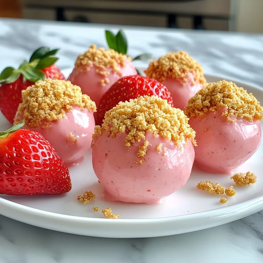 Delicious and nutritious protein balls with the flavors of strawberry cheesecake, perfect for a quick snack.