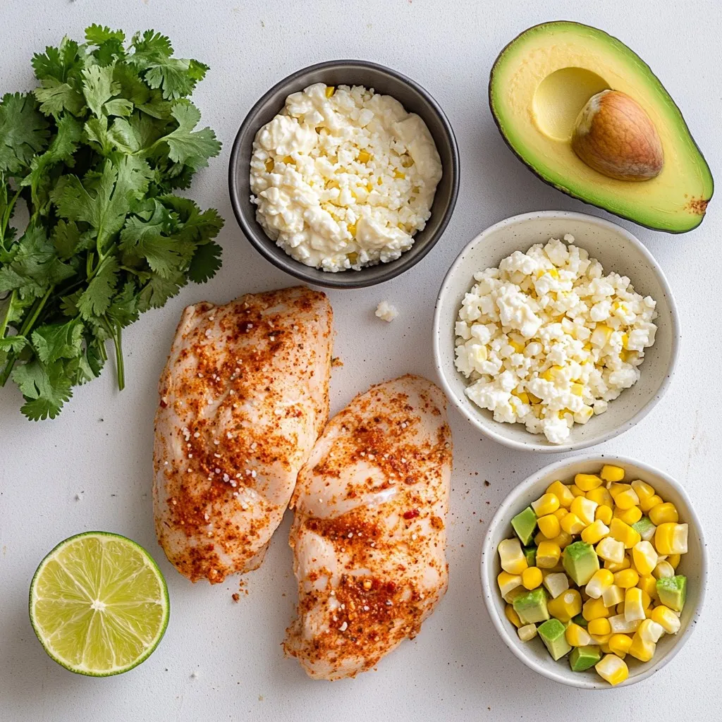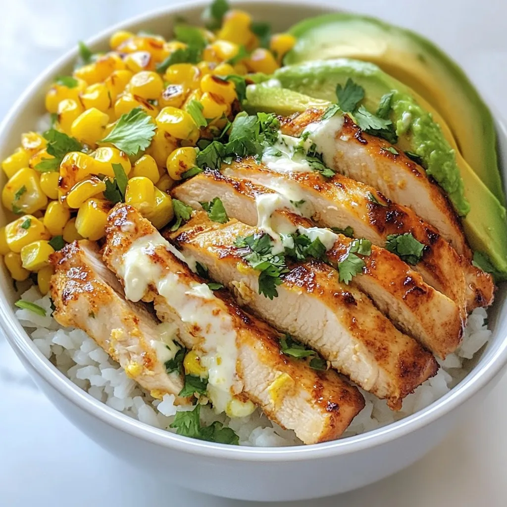 - 1 cup cooked jasmine rice - 2 boneless, skinless chicken breasts - 1 cup corn kernels (fresh, frozen, or canned) - 1 teaspoon chili powder - 1/2 teaspoon garlic powder - 1/2 teaspoon smoked paprika - Salt and pepper to taste - 1/4 cup mayonnaise - 1/4 cup feta cheese, crumbled - 2 tablespoons fresh cilantro, chopped - 1 avocado, sliced - Juice of 1 lime - Optional: Hot sauce for drizzling To make this Street Corn Chicken Rice Bowl, start with fresh, quality ingredients. The star of this dish is the jasmine rice. It gives a fluffy base that pairs well with the chicken and corn. For the chicken, I use boneless and skinless breasts. They cook quickly and stay juicy. The corn adds a sweet crunch, whether you choose fresh, frozen, or canned. I suggest using fresh corn in summer for the best flavor. Next, let’s talk about seasonings. The chili powder adds heat, while garlic powder and smoked paprika give depth. Don’t forget salt and pepper; they enhance all the flavors. Now, the dressing and garnishes bring this bowl to life. I mix mayonnaise with crumbled feta for a creamy topping. The fresh cilantro adds brightness, and the avocado slices bring smoothness. A squeeze of lime juice ties everything together with a zesty kick. If you like heat, drizzle some hot sauce on top. This bowl is not just tasty; it’s colorful and fun! {{ingredient_image_2}} - Season the Chicken: First, take the chicken breasts and season both sides. Use chili powder, garlic powder, smoked paprika, salt, and pepper. Make sure to coat evenly. This step adds a lot of flavor to the chicken. - Cook the Chicken: Heat olive oil in a skillet over medium-high heat. Once hot, add the seasoned chicken. Sear each side for 6-7 minutes. You want a nice golden brown color. Check that it reaches 165°F inside. Remove from the skillet and let it rest for a few minutes. Then slice it into thin strips. - Use the Same Skillet for Maximizing Flavor: Keep all those tasty drippings in the skillet. They add great flavor to the corn. - Char the Corn and Finish with Lime Juice: Add the corn kernels to the skillet. Sauté for about 3-4 minutes. Stir frequently until the corn begins to char. Remove from heat and squeeze fresh lime juice over the corn. Toss it to coat well. - Combine Mayonnaise and Feta Cheese in a Bowl: In a small bowl, mix the mayonnaise and crumbled feta cheese. - Blend Until Smooth for Creamy Texture: Stir the mixture until it is completely smooth. This creamy dressing ties the bowl together. - Start with Jasmine Rice as the Base: Place a generous scoop of jasmine rice in each bowl. This rice serves as the foundation for your meal. - Layer Chicken, Corn, and Avocado on Top: Next, arrange the sliced chicken over the rice. Add the sautéed corn and slices of avocado on top. Each layer adds flavor and texture. - Drizzle with Feta Mayonnaise Dressing: Generously drizzle the creamy dressing over the bowls. It adds richness to each bite. - Garnish with Cilantro and Optional Hot Sauce: Finally, sprinkle fresh cilantro on top. If you like heat, drizzle some hot sauce over it. This adds the perfect finishing touch. - Ensure chicken reaches internal temperature of 165°F/75°C. - Avoid overcooking the corn for the best texture. Cooking chicken correctly is key. Use a meat thermometer to check. It helps avoid dryness. For corn, cook just until it's tender and slightly charred. This gives it a nice bite and keeps the flavor fresh. - Serve in vibrant bowls for aesthetic appeal. - Add lime wedges on the side for extra zest. Using colorful bowls makes the dish pop. It adds to your meal's overall fun. Lime wedges add a burst of flavor. Squeeze them on top right before you eat. - Modify chili powder according to taste preference. - Use more or less hot sauce based on spice tolerance. Start with a small amount of chili powder. You can always add more if you want heat. For hot sauce, drizzle carefully. Everyone has different spice limits, so adjust to what you enjoy! Pro Tips Marinate for Flavor: For even more flavor, consider marinating the chicken in the spices for at least 30 minutes or overnight. This allows the spices to penetrate the meat more deeply. Perfectly Cooked Corn: If using fresh corn, grill it first for a smoky flavor before adding it to the skillet. This enhances the sweetness and adds a nice char. Adjusting Creaminess: If you prefer a lighter dressing, you can mix Greek yogurt with the mayonnaise instead of using all mayonnaise for a creamier yet healthier option. Layering for Texture: Layer the ingredients in the bowl with a bit of each component visible from the side. This not only looks appealing but also allows for a delightful mix of textures in every bite. {{image_4}} You can swap the chicken for shrimp or tofu. Shrimp cooks fast and adds a nice taste. Tofu gives a great texture and is perfect for vegans. If you want more meat, consider using grilled steak. It adds a hearty flavor to your bowl. Instead of jasmine rice, try quinoa or brown rice. Both add unique flavors and nutrients. Quinoa is higher in protein, making it a healthy choice. For a low-carb option, use cauliflower rice. It’s light and will absorb the flavors well. To boost taste, add black beans to your bowl. They add protein and fiber, making your meal heartier. If you like spice, toss in some jalapeños. They bring heat and a fresh crunch to every bite. Keep your street corn chicken rice bowl in airtight containers in the fridge. This helps maintain freshness and flavor. Consume within 2-3 days for best quality. After that, the taste might change, and the texture may not be as nice. When you reheat your bowl, the microwave or a skillet works best. If you use a microwave, heat in short bursts. This helps avoid overcooking. In a skillet, warm it over medium heat. Add a splash of water to keep it moist while reheating. This simple step prevents dryness and helps keep flavors bright. You can freeze the cooked chicken and corn separately. This way, they 