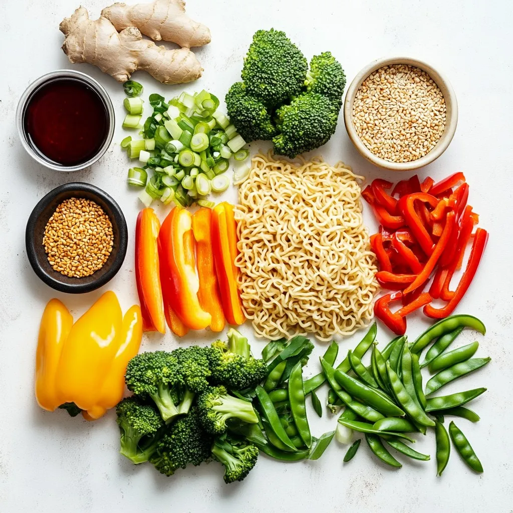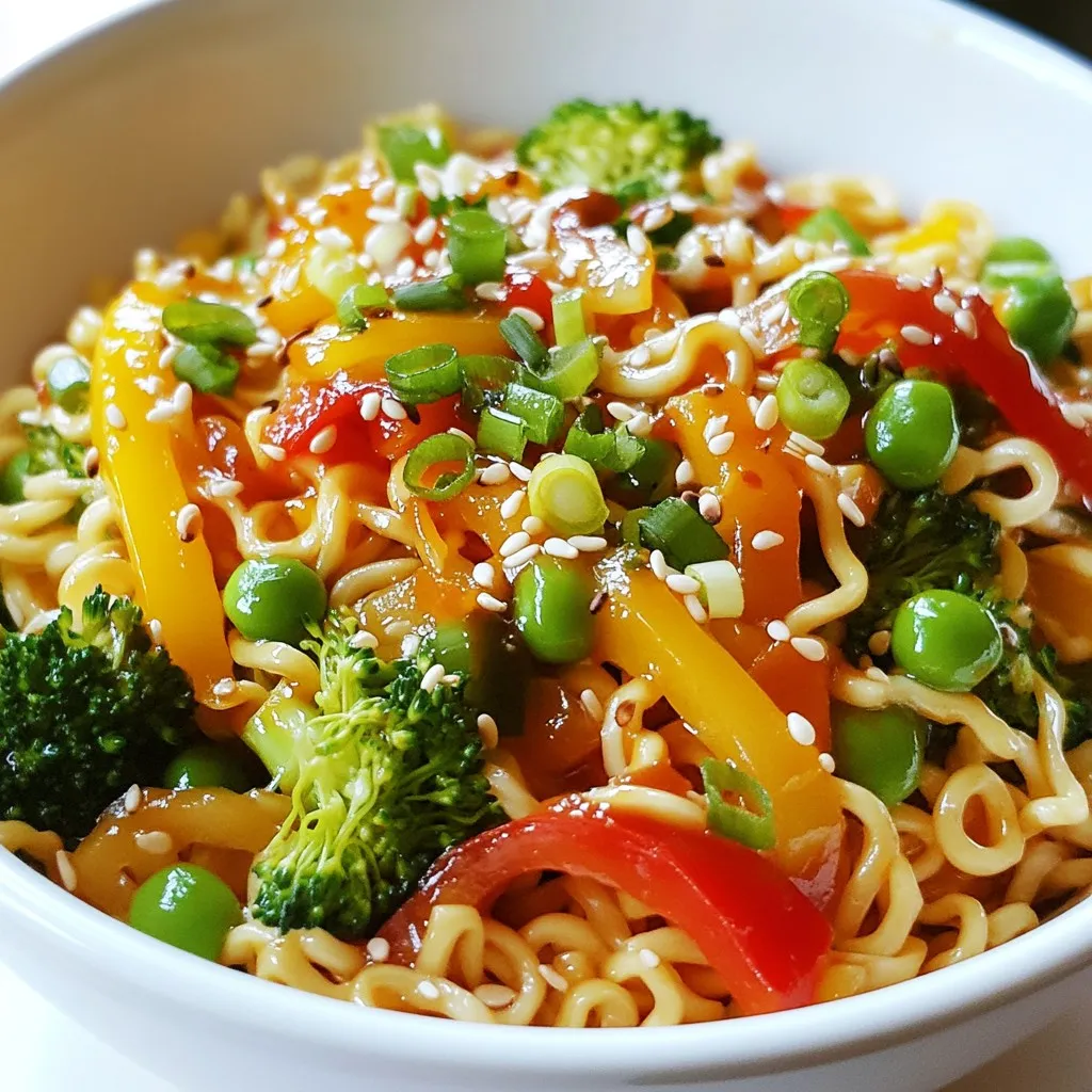 - 2 packs of instant ramen noodles (discard seasoning packets) - 1 tablespoon vegetable oil - 1 medium red bell pepper, sliced into thin strips - 1 medium yellow bell pepper, sliced into thin strips - 1 cup broccoli florets, cut into bite-sized pieces - 1 cup snap peas, trimmed - 2 green onions, chopped (white and green parts separated) - 2 cloves garlic, minced - 1 tablespoon fresh ginger, grated - 3 tablespoons soy sauce - 2 tablespoons sweet chili sauce - 1 tablespoon Sriracha (adjust for heat preference) - 1 teaspoon sesame oil - Sesame seeds for garnish - Large pot for boiling - Colander for draining noodles - Large skillet or wok for sautéing - Mixing bowl for sauce ingredients - Tongs or spatula for mixing If you want a twist, you can swap the bell peppers for carrots or zucchini. For a vegan option, use a plant-based sweet chili sauce. You can also replace the soy sauce with tamari for a gluten-free choice. If you don’t have Sriracha, try chili garlic sauce or red pepper flakes instead. Enjoy making this recipe your own! {{ingredient_image_2}} Start by boiling water in a large pot. Add salt to the water for flavor. Once the water boils, add the ramen noodles. Cook them for about 3-4 minutes, or as the package says. When done, drain the noodles in a colander and set them aside. This step is crucial to get the right texture for your stir fry. Next, heat the vegetable oil in a large skillet or wok over medium-high heat. Add the sliced red and yellow bell peppers, broccoli florets, and snap peas. Stir-fry these for about 4-5 minutes. Keep stirring to make sure they cook evenly. You want the veggies to be bright and slightly tender but still crunchy. This adds a great texture to your dish. While the veggies cook, grab a small bowl. In it, mix the soy sauce, sweet chili sauce, Sriracha, and sesame oil. Whisk them together until they blend well. Adjust the Sriracha based on how spicy you want it. Once the vegetables are ready, add the cooked ramen noodles to the skillet. Pour the sauce over everything. Use tongs to mix carefully. Make sure all the noodles and veggies get coated in that tasty sauce. Heat it all together for 2-3 minutes. Now, you have a colorful and flavorful Sweet & Spicy Ramen Stir Fry! To get the best texture in your stir fry, start with high heat. This helps keep your veggies crisp. Cook them just until they are bright and tender. Aim for about 4-5 minutes. Overcooking will make them mushy. Always keep stirring for even cooking. When you add the ramen, toss gently to mix everything. This way, the noodles stay firm and tasty. Spice can make or break your dish. To control the heat, start small with Sriracha. You can always add more later if you want it hotter. Mix the sauce and taste it. If it’s too spicy, try adding more sweet chili sauce to balance it out. Remember, you can also add some sugar or honey for sweetness. Layering flavors is key to making this dish shine. Use fresh garlic and ginger for a strong base. They add warmth and depth. Don’t forget the soy sauce; it gives that savory umami kick. Sesame oil adds a nice nuttiness at the end. For extra flavor, finish with sesame seeds and green onions. This will make your dish not only tasty but also look beautiful. Pro Tips Use Fresh Ingredients: Fresh vegetables will enhance the flavor and texture of your stir fry. Opt for seasonal produce whenever possible. Adjust the Spice: Feel free to modify the amount of Sriracha based on your heat preference. You can also experiment with other hot sauces for different flavors. Customize Your Protein: Add your choice of protein such as chicken, shrimp, or tofu to make this dish more filling. Just cook it before adding the vegetables. Don’t Overcook the Noodles: To maintain the perfect texture, undercook the noodles slightly as they will continue to cook when combined with the hot vegetables and sauce. {{image_4}} You can easily add protein to your Sweet & Spicy Ramen Stir Fry. Chicken works great. Just slice it thinly and cook it before the veggies. Use about 1 cup of raw chicken. Sauté it in the oil until it's cooked through. Tofu is another good choice. Press it to remove moisture, then cube it. Add it to the pan with the veggies for a nice texture. For a vegetarian or vegan version, skip the chicken. Instead, use tofu or tempeh. Both add protein and flavor. You can also add beans like edamame for extra nutrition. Adjust the sauces to ensure they're vegan-friendly. Most soy sauces and sweet chili sauces are vegan, but always check the labels. Feel free to mix up the veggies in this stir fry. You can use carrots, zucchini, or even bok choy. Each vegetable gives a unique taste and texture. Aim for a mix of colors for a vibrant dish. Just remember to keep the cooking times in mind. Softer veggies need less time, while firmer ones like broccoli may need a bit longer. After enjoying your Sweet & Spicy Ramen Stir Fry, let it cool down. Place it in an airtight container. This dish stays fresh in the fridge for up to three days. Make sure to seal it well to keep the flavors intact. To reheat, take your ramen stir fry from the fridge. You can use a skillet or microwave. In a skillet, heat over medium heat. Stir occasionally until hot. In the microwave, cover it loosely and heat for 1-2 minutes. Stir halfway through for even heating. If you want to save some for later, you can freeze it! Place the cooled stir fry in a freezer-safe container. It can last for up to three months in the freezer. When you're ready to eat, thaw it in the fridge overnight before reheating. You should use instant ramen noodles for this recipe. They cook quickly and are easy to find. Discard the seasoning packets that come with them. This way, you can control the flavors in your stir fry. Feel free to choose any brand you like. Yes, you can make this dish gluten-free. Choose gluten-free ramen noodles instead of regular ones. Many brands offer this option now. Also, use gluten-free soy sauce for the s