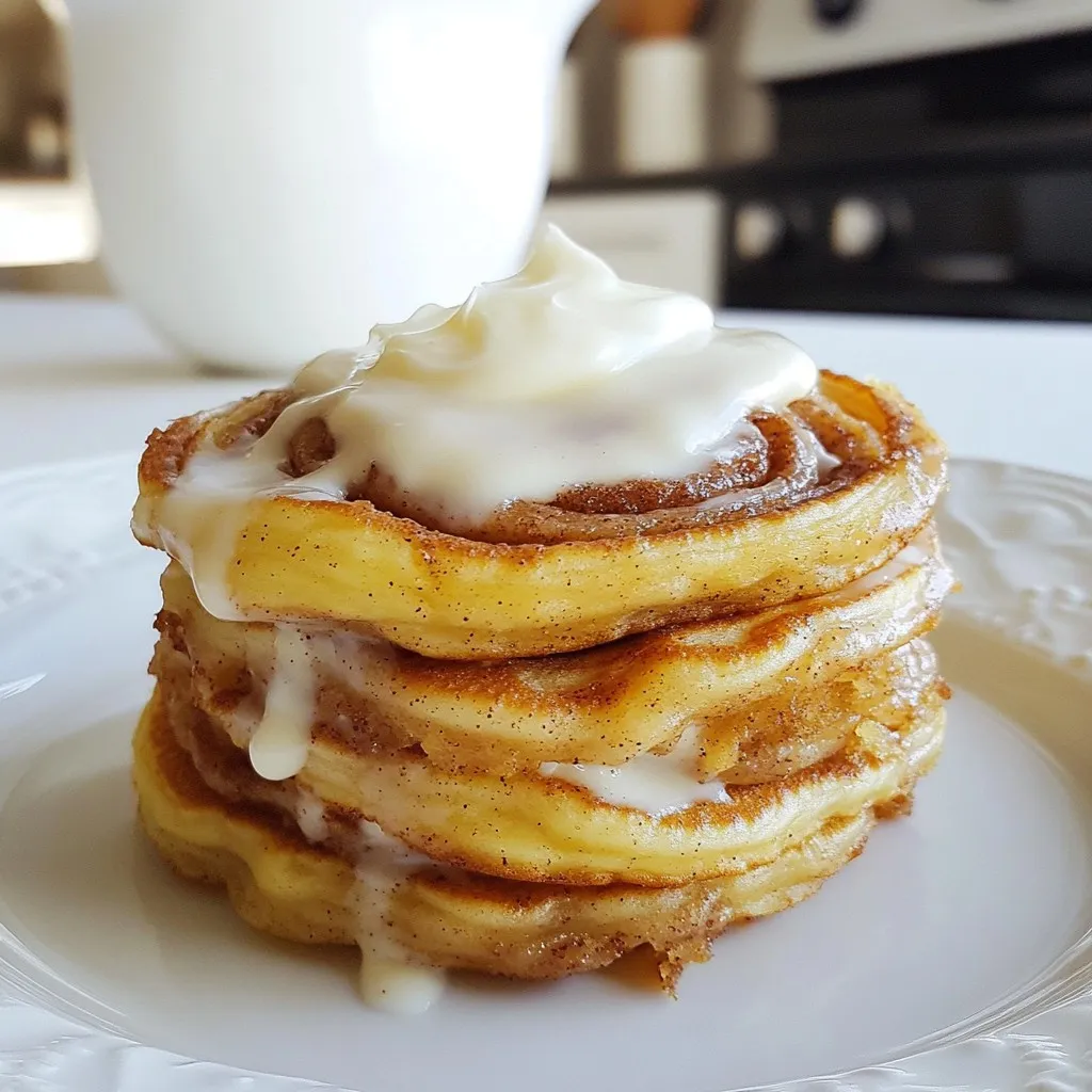 Heat a non-stick skillet over medium heat. Make sure it’s hot before adding batter. For each pancake, pour about 1/4 cup of batter onto the skillet. With a spoon or piping bag, swirl about 1 tablespoon of cinnamon filling over the batter. Cook until bubbles form on the surface, about 2-3 minutes. Flip the pancake and cook for another 1-2 minutes, until golden brown. Repeat with the rest of the batter, adding more butter if needed. Stack the pancakes warm and drizzle with cream cheese frosting for a tasty finish.