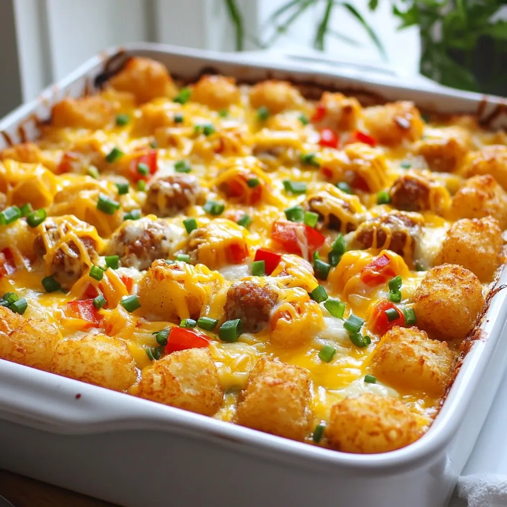 A hearty breakfast casserole featuring layers of tater tots, crumbled sausage, eggs, and cheese.